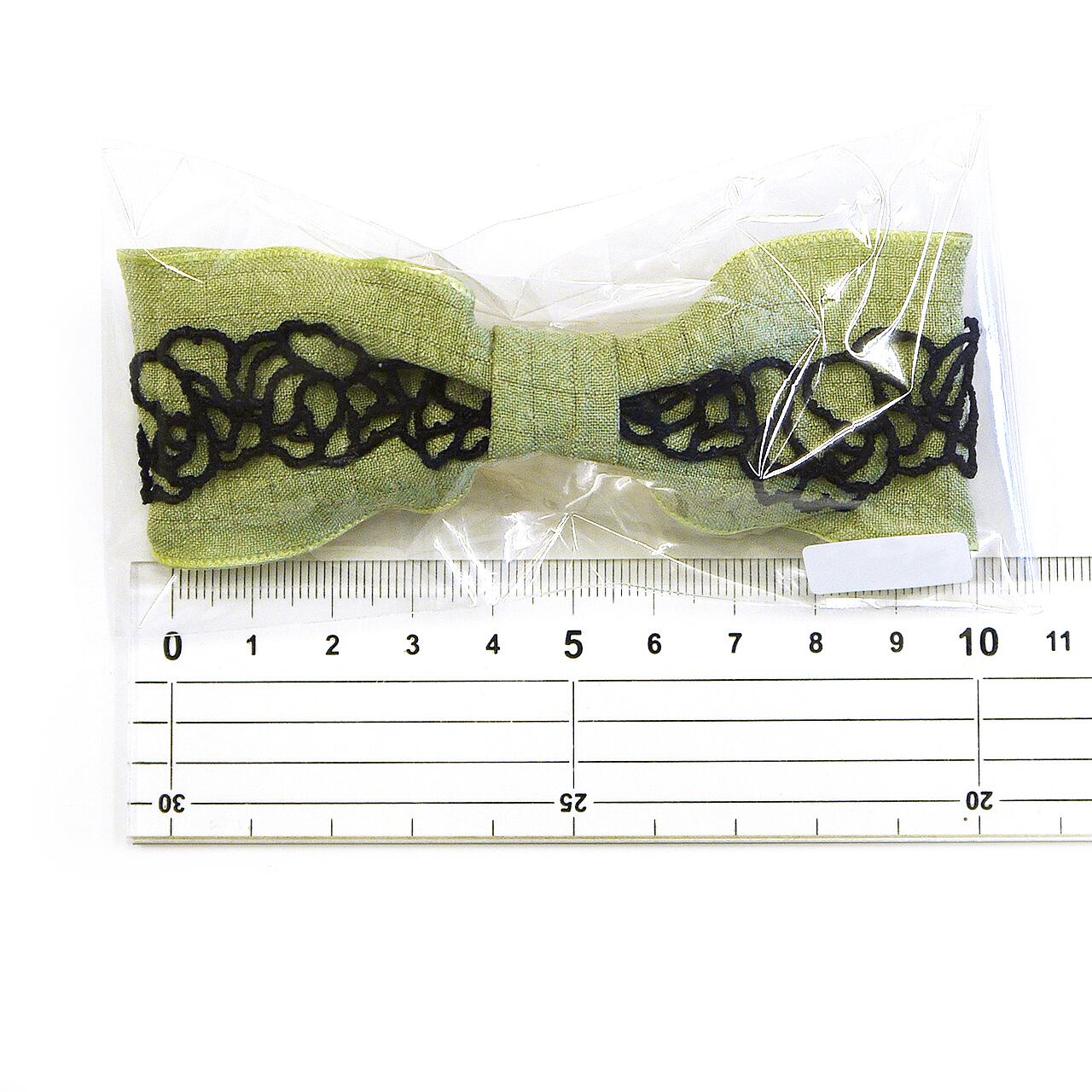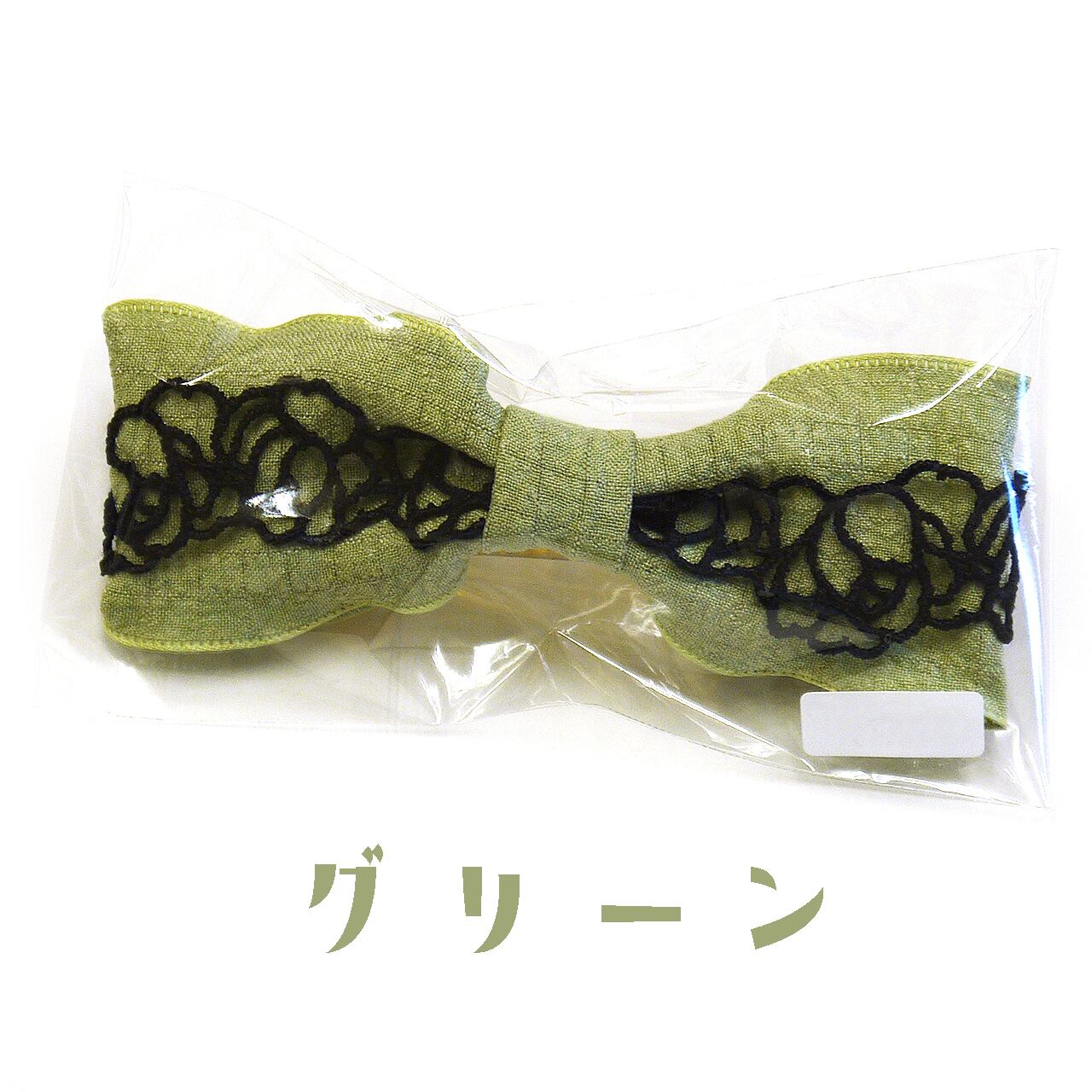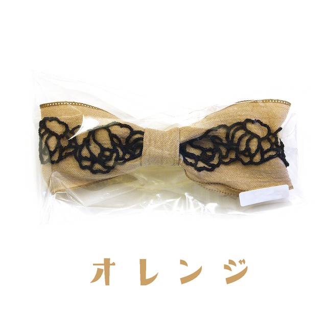 柔らかくシックなカラーのリボンに、薔薇を象った黒いレースを組み合わせた作品。大人かわいさとガーリーさを併せ持つデザインです。