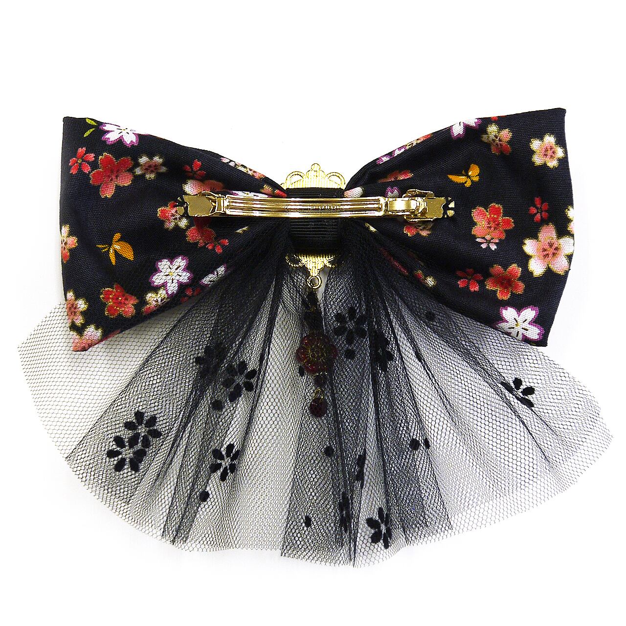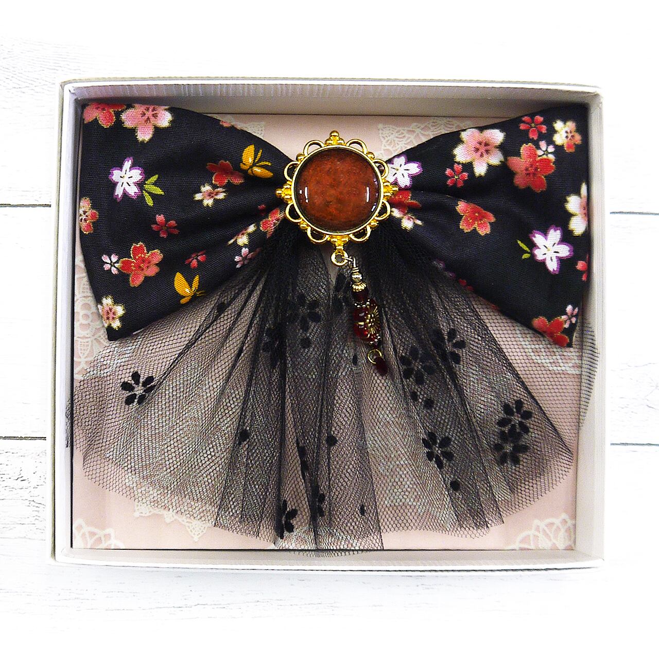 桜柄の黒いリボンに、花柄が入った黒のレースを合わせたリボンに、魔導石とビーズが煌めきます。シックで和洋の雰囲気を併せ持ったバレッタです。