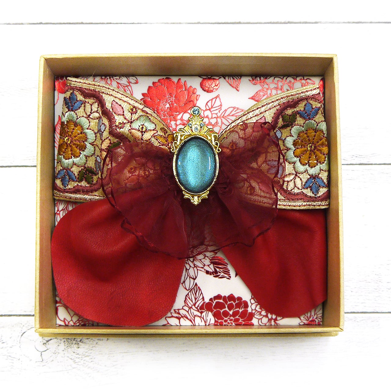 金の刺繍リボンに真っ赤な本革とフリルを合わせ、色差のある魔導石が映えるデザイン。異国情緒のある個性的なバレッタです。