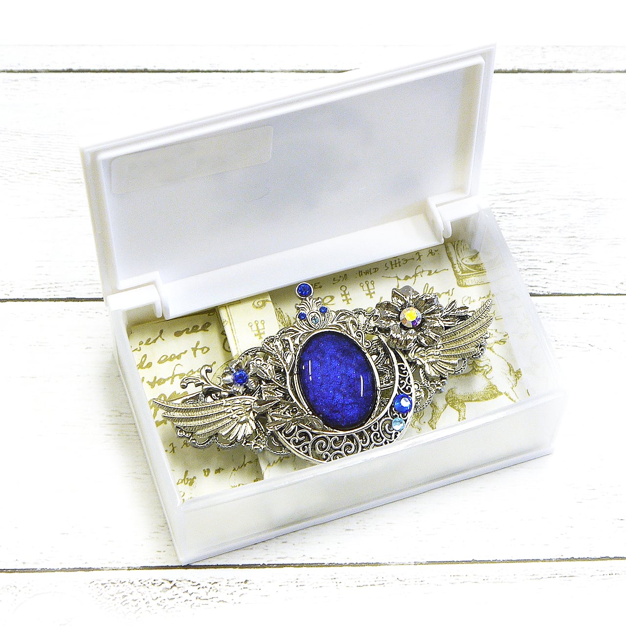 バレッタのように手軽にしっかり止まるヘアクリップです。おうちで飾れるケース付きです。