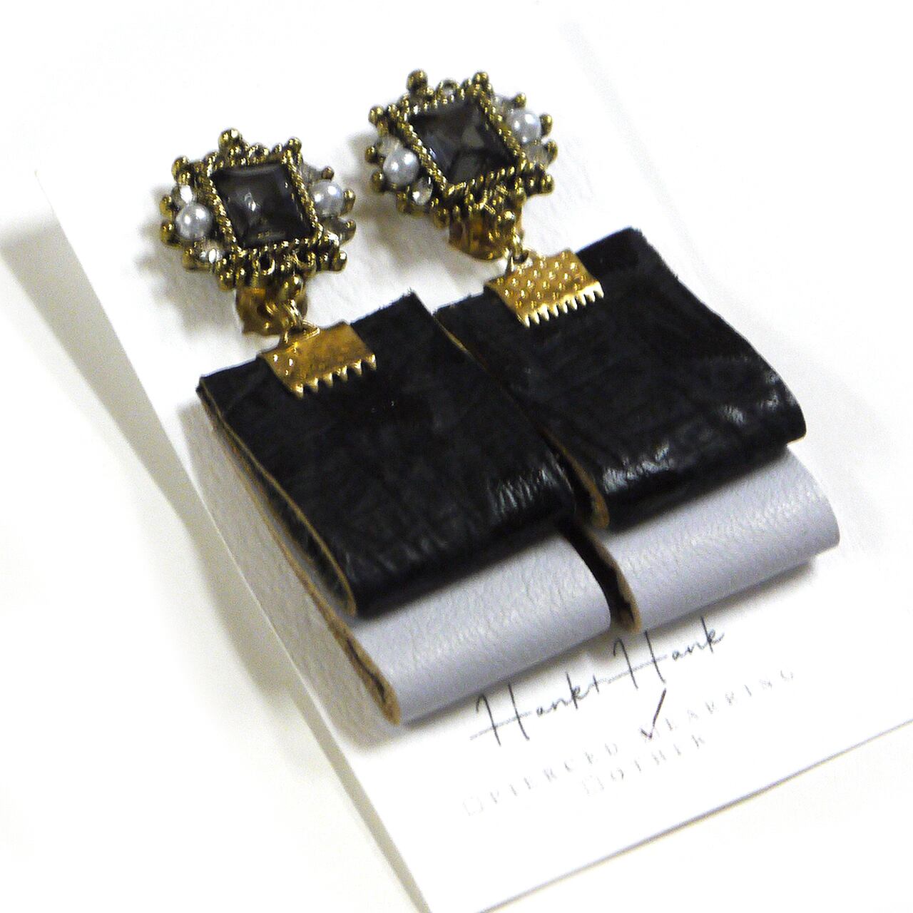 アンティーク風デザインに、モノトーンの革を組み合わせたゴシックなイヤリング。革の風合いの違いも味わえる作品です。