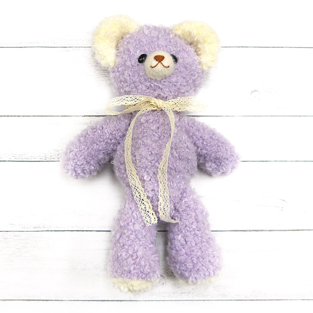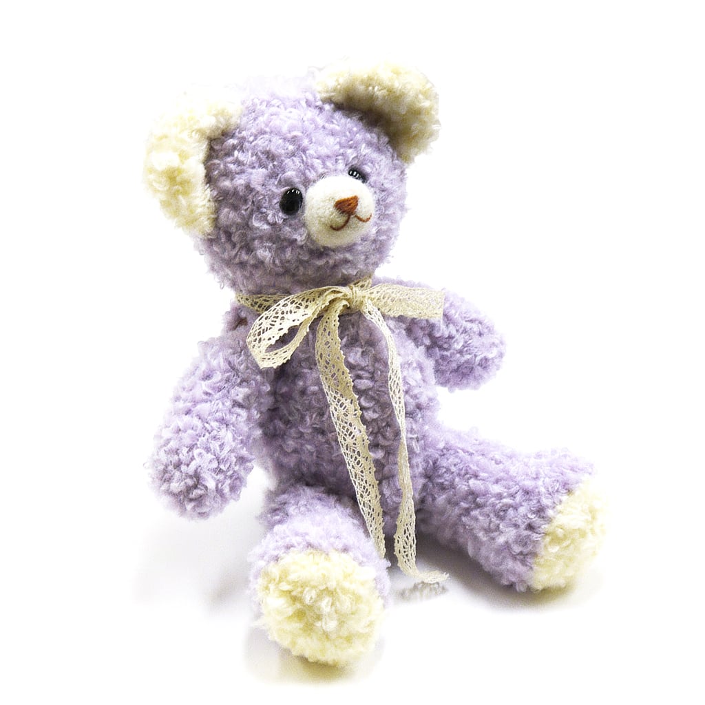 手足が稼働する、テディベアタイプのあみぐるみ。ふわっふわの手触りがいい紫色で、抱きしめたくなります。ちょっとたれ目なお顔もキュートですね。