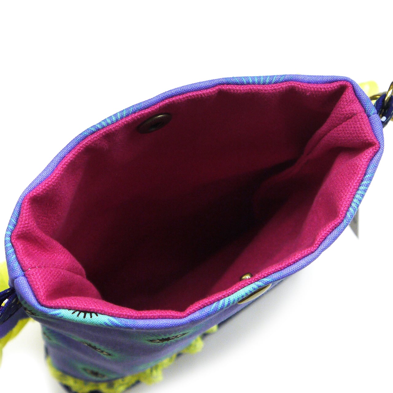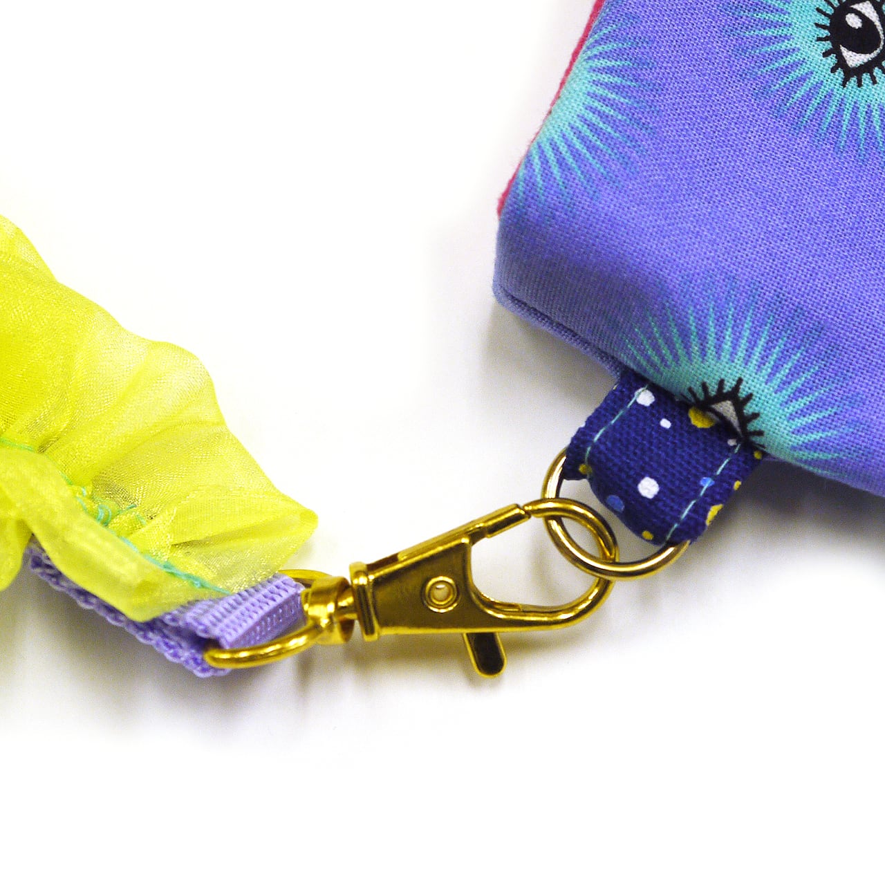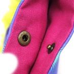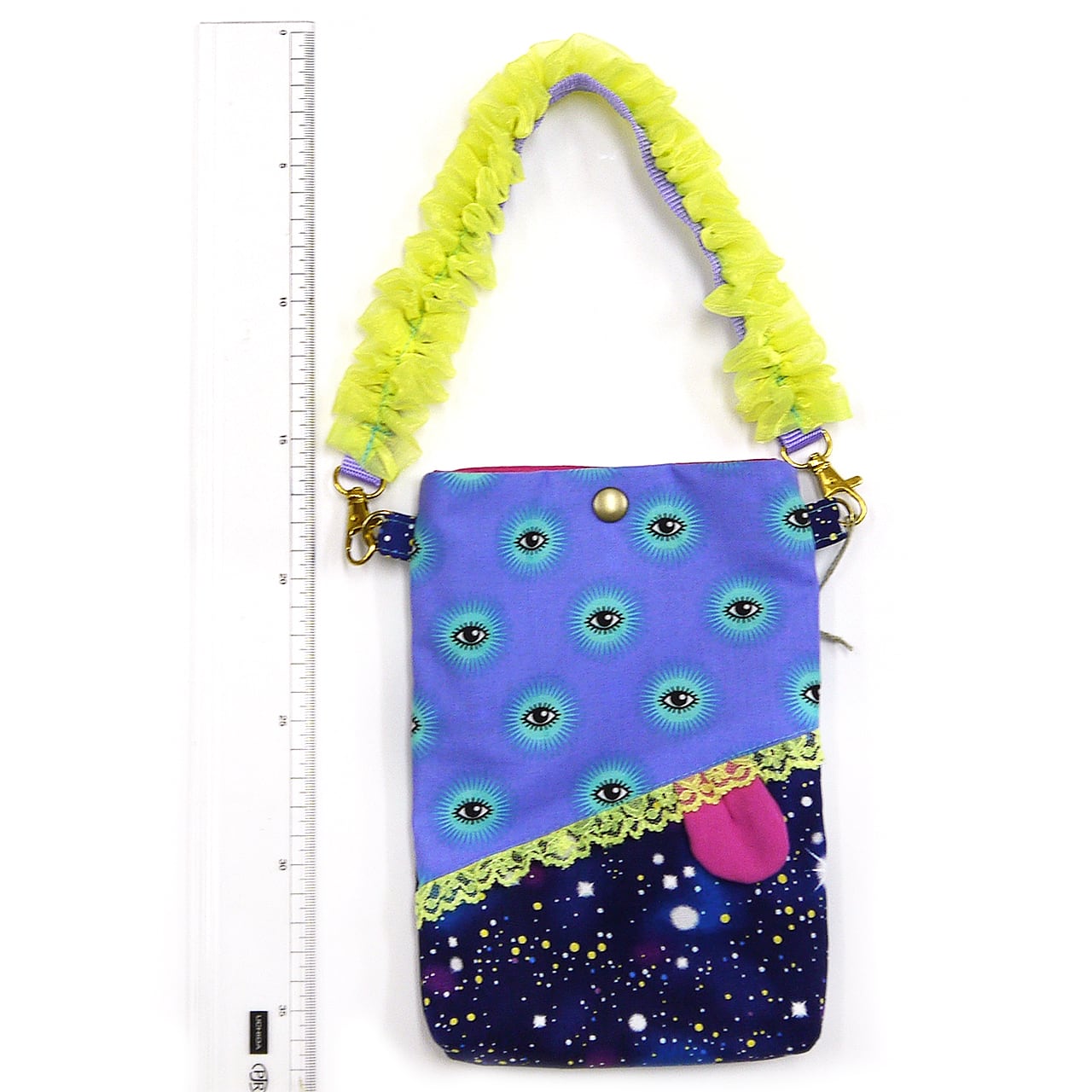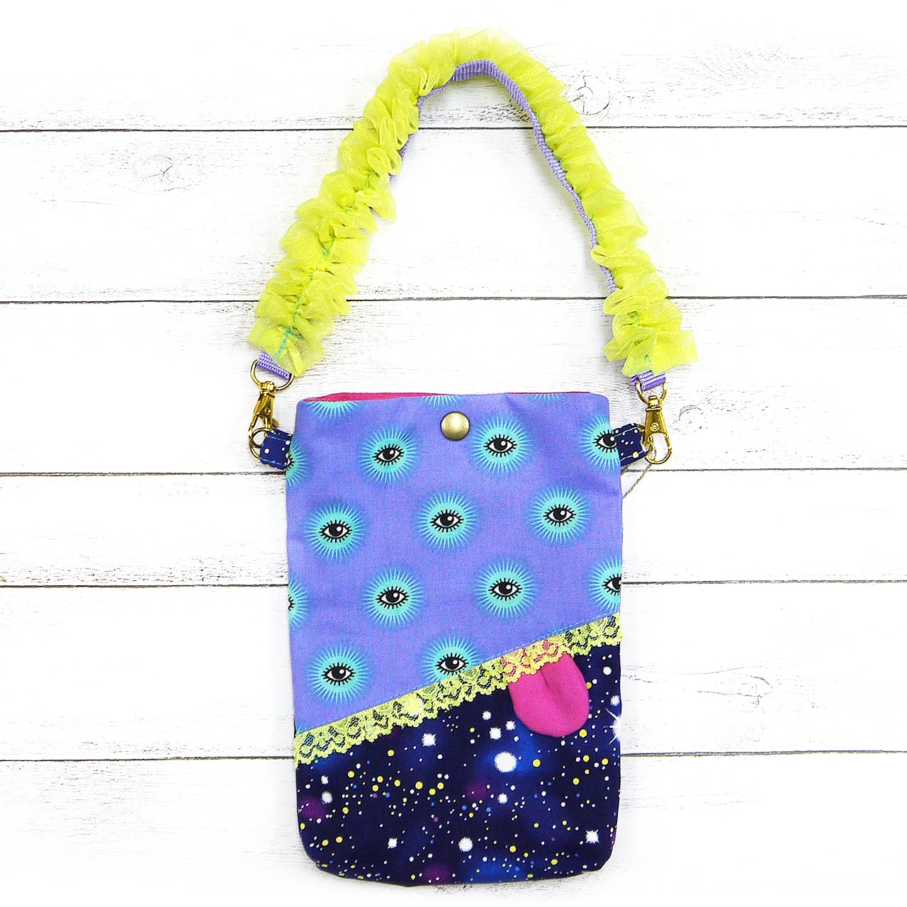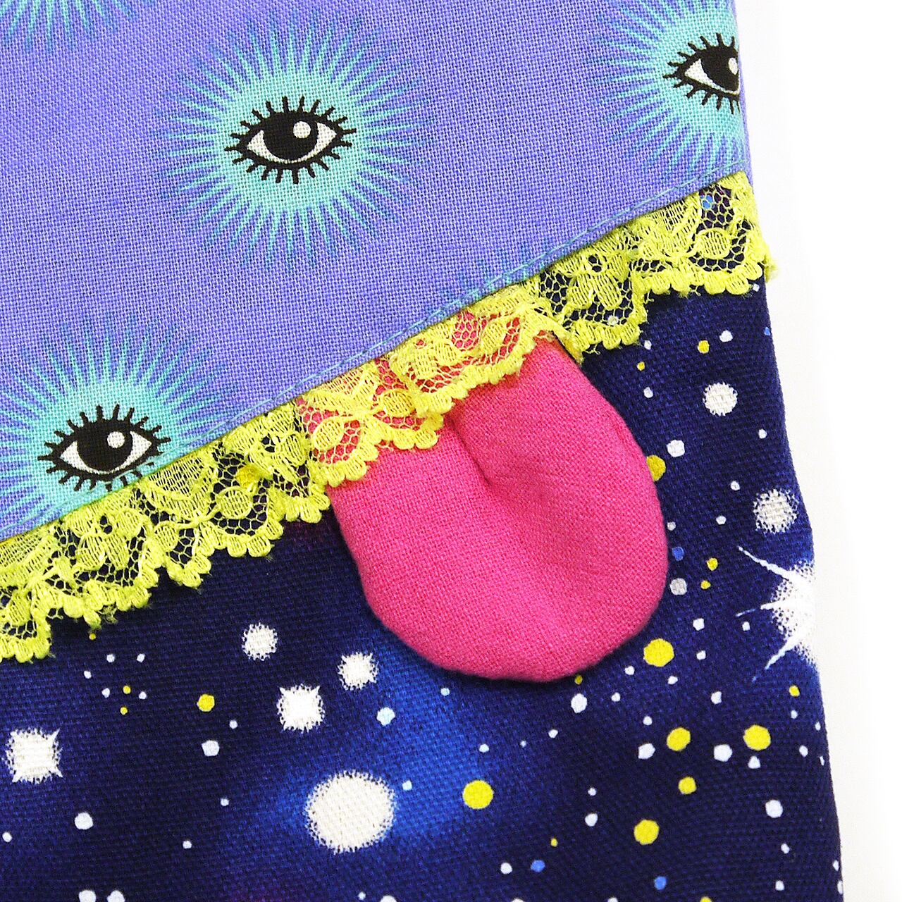 目玉柄の生地にぺろんと出た舌。個性的で思わず見つめてしまう魅力が詰まった作品です。スマホがすっぽり入るサイズで、口部分はホックがついています。