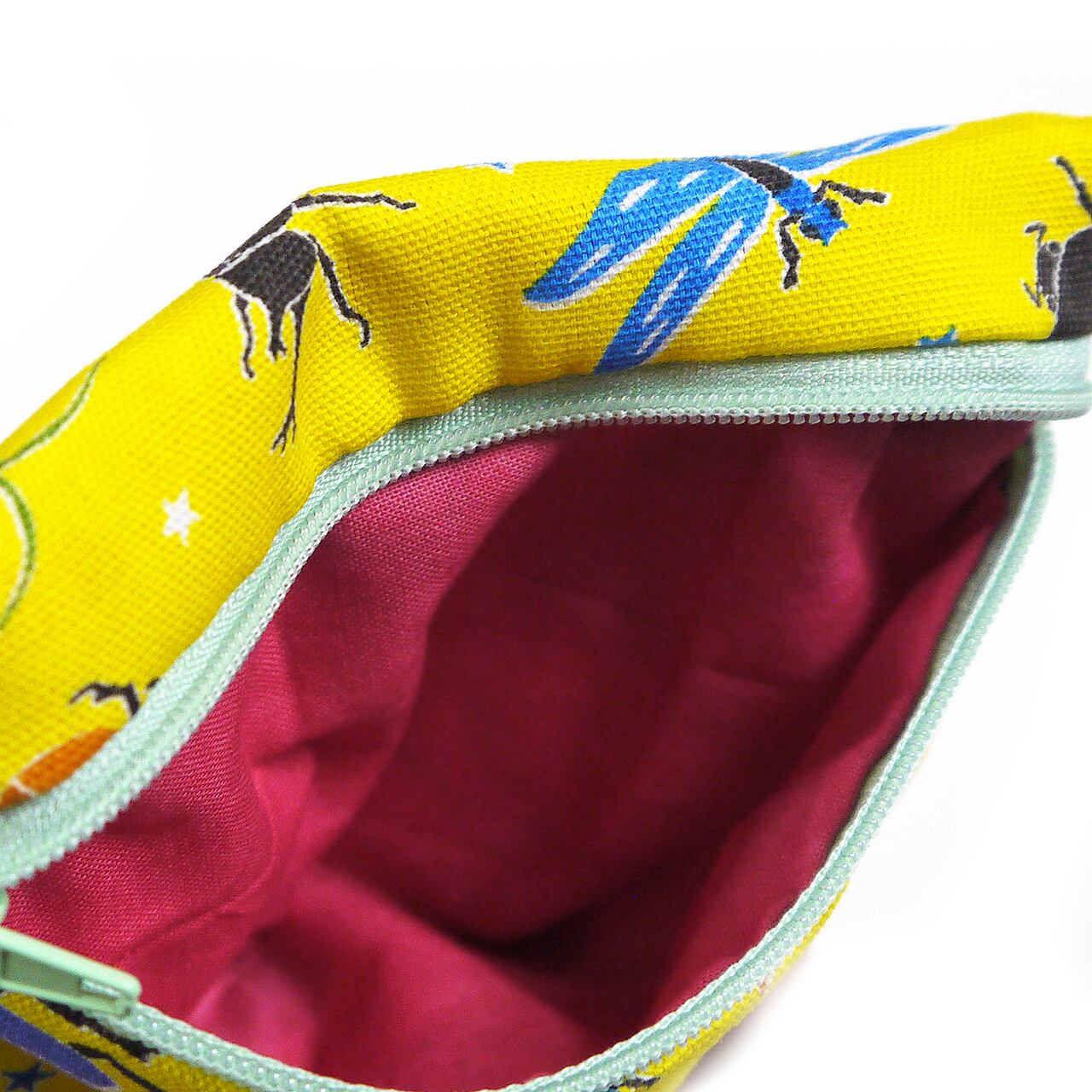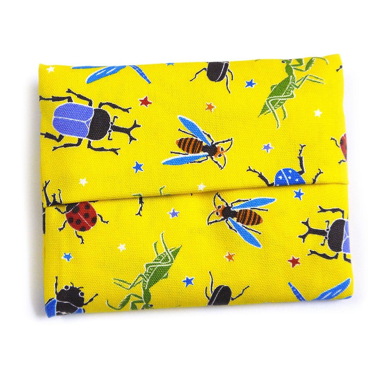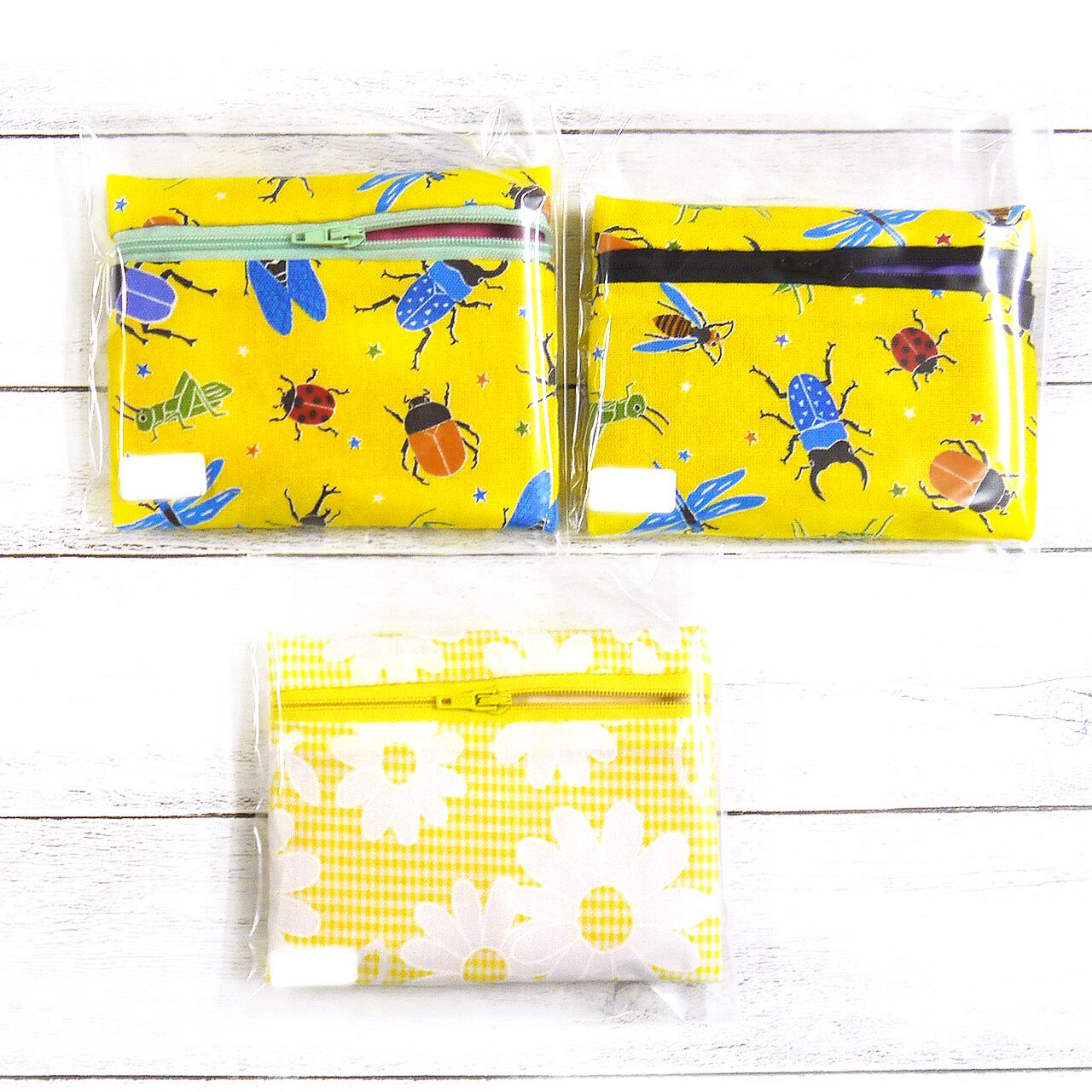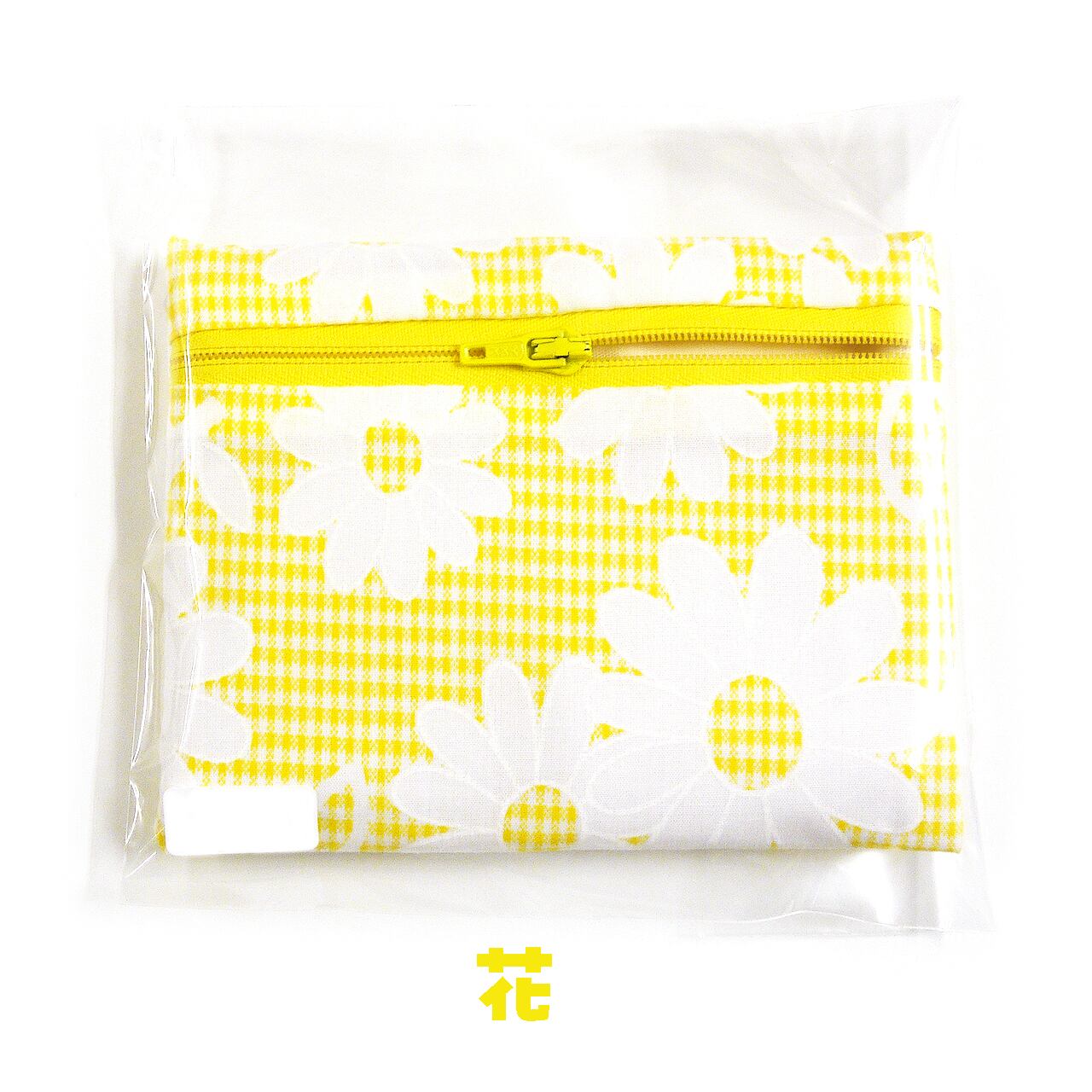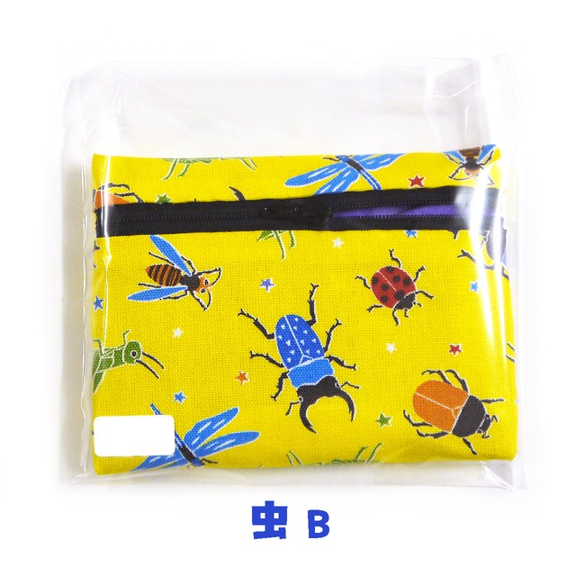 お子さんに人気の虫柄と万能に使えるお花柄があります。ファスナー付きのポーチがついており、ハンカチやアクセサリー、お薬など小物を一緒に入れておくのに便利です。