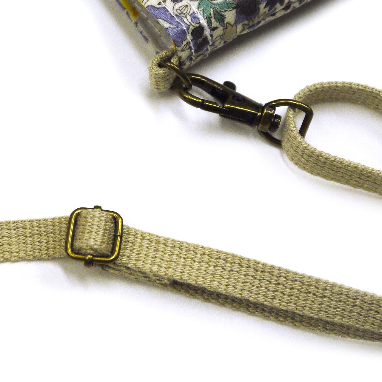 口部分はマグネットホック、肩紐は長さ調節が可能になっています。長財布とスマホが縦に入るサイズです。内ポケットがひとつついています。