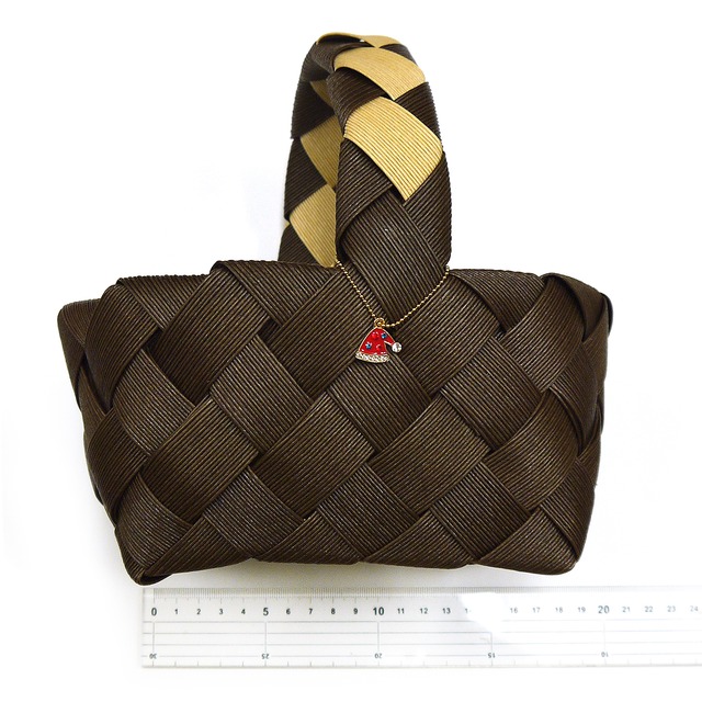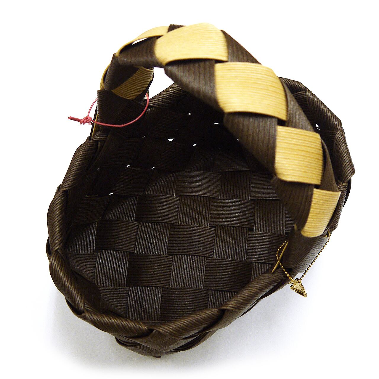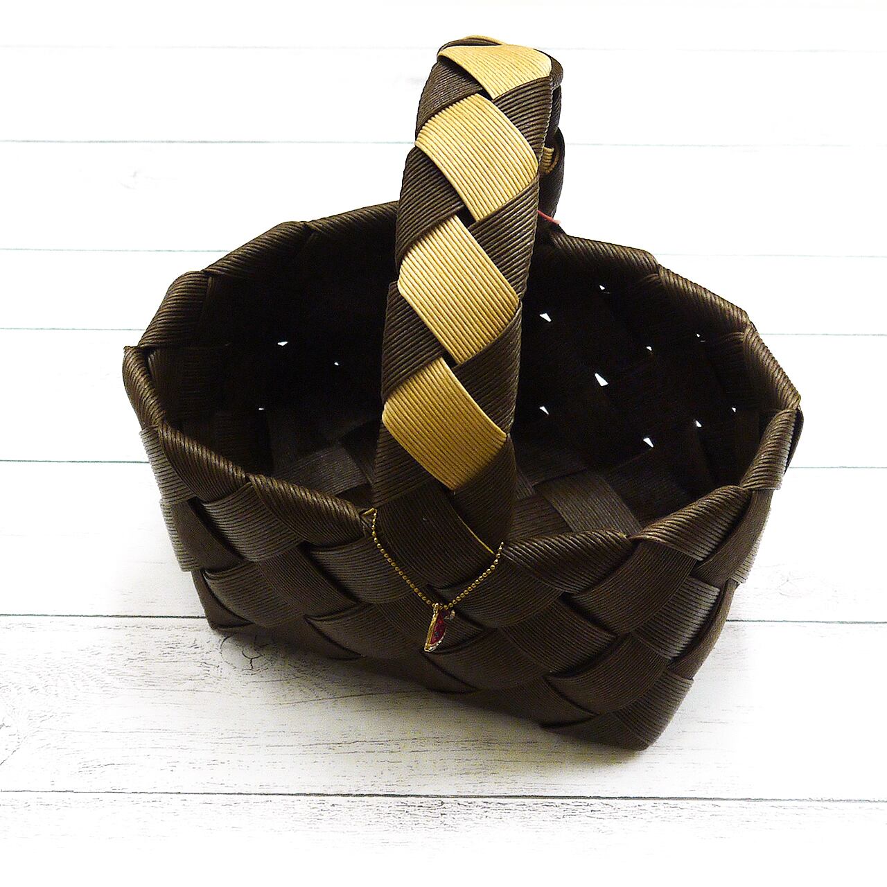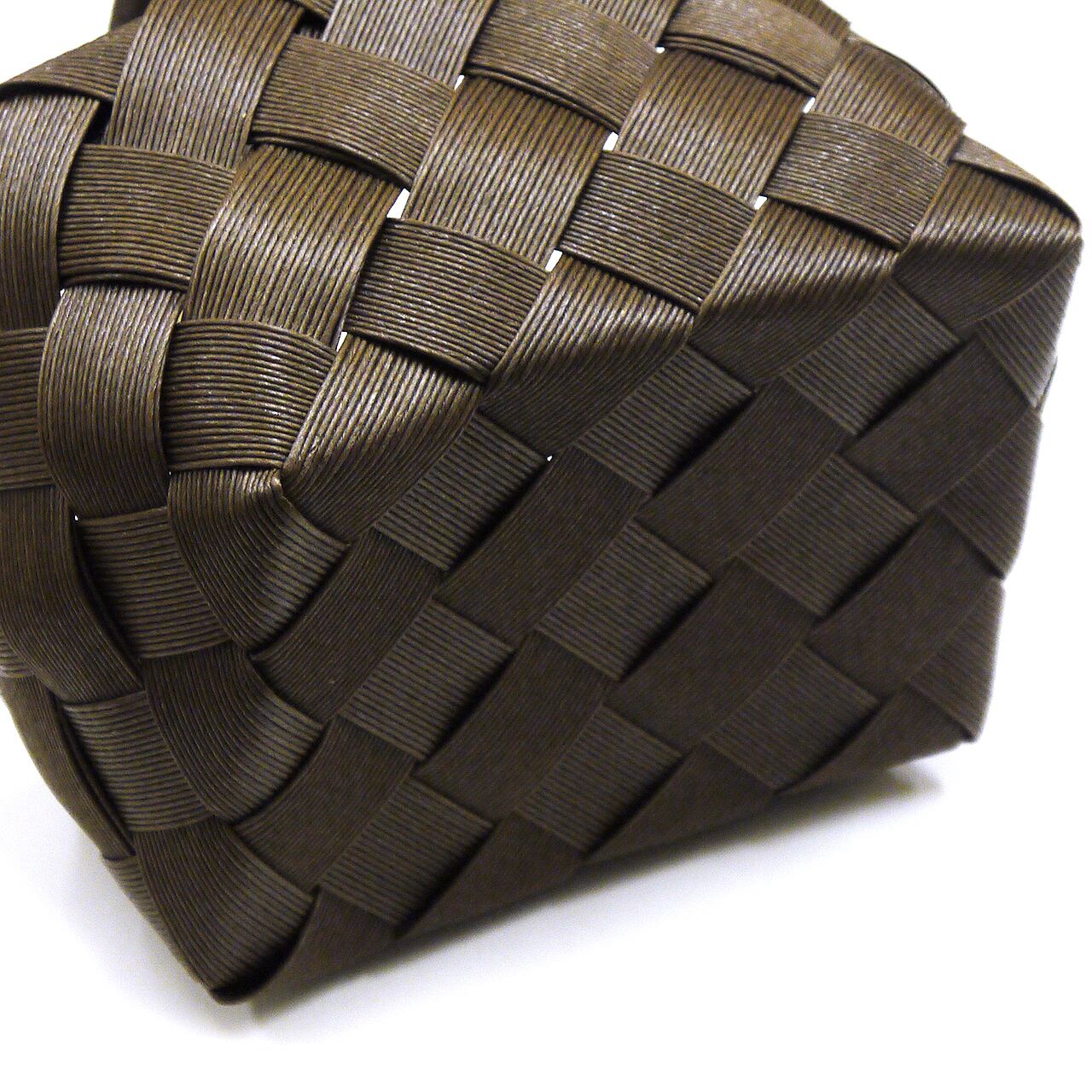 シックな茶色で、太いクラフトバンドを編み込んだバスケット。持ち手も太くしっかりしており、持ちやすいデザインと軽さです。