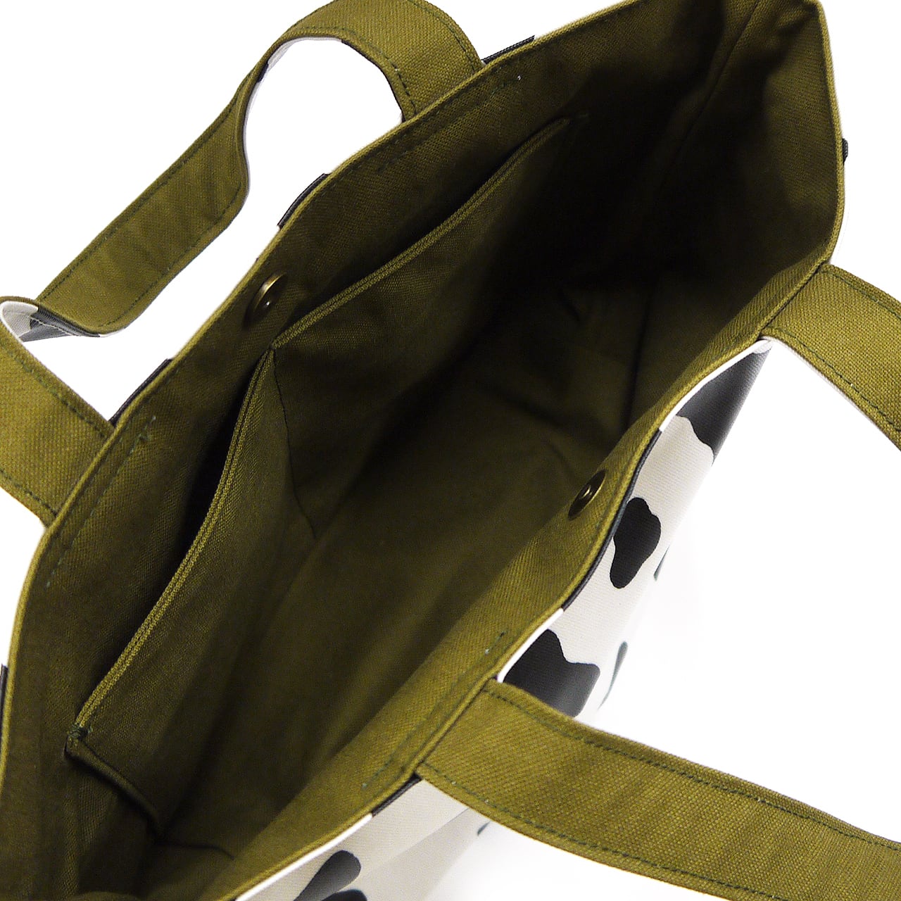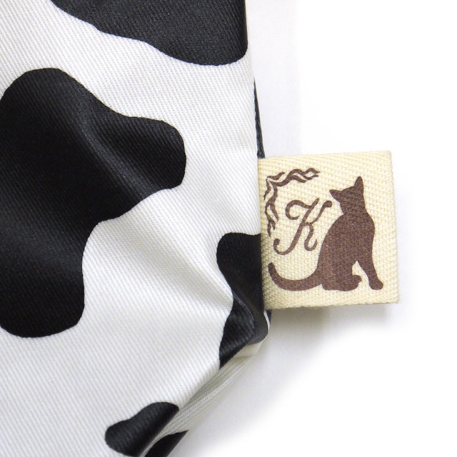 白と黒のお馴染みの柄。表面は水に強いラミネート生地で、裏地は深緑の丈夫な帆布生地になっています。内部にポケット、口にはマグネットホック付き付きです。