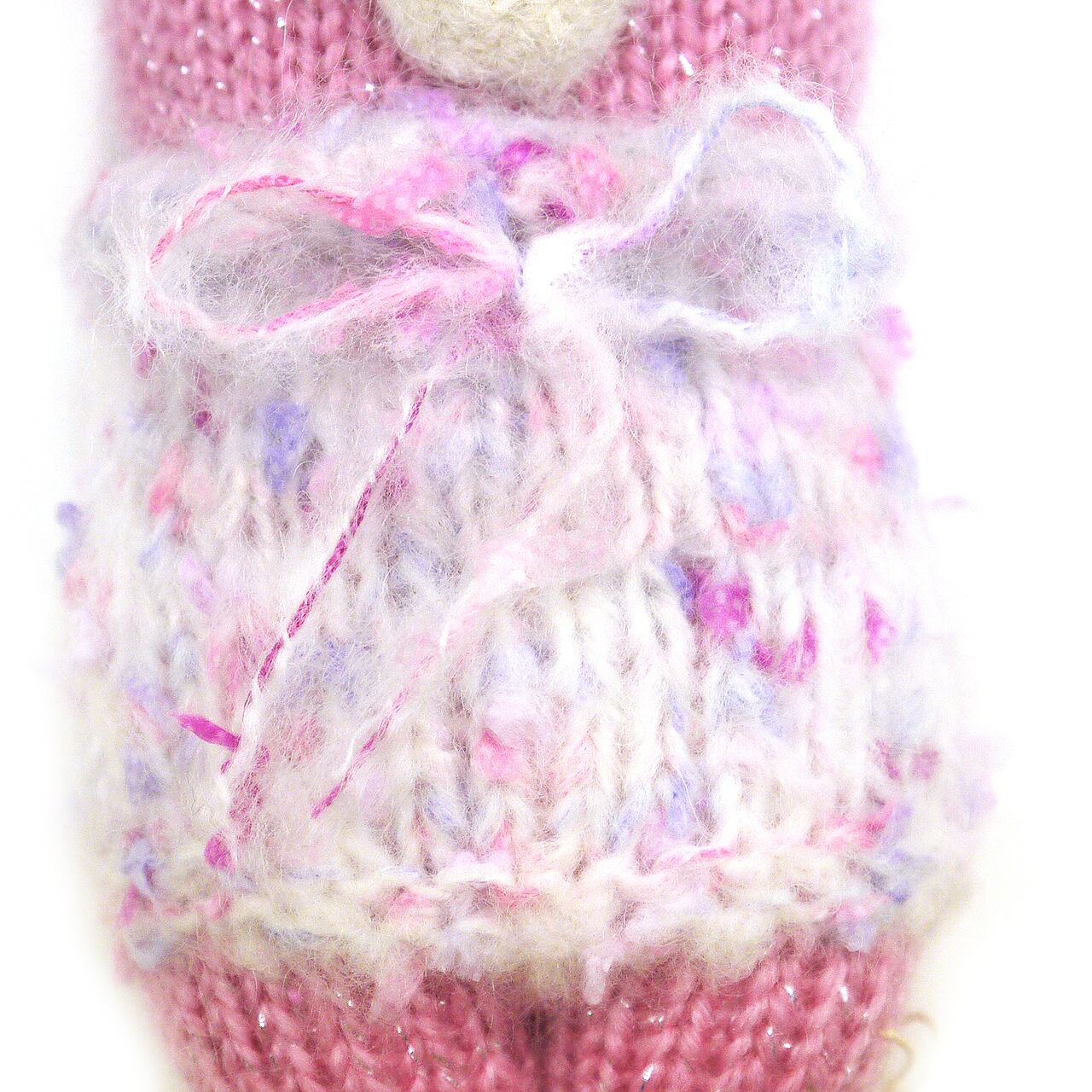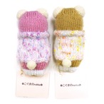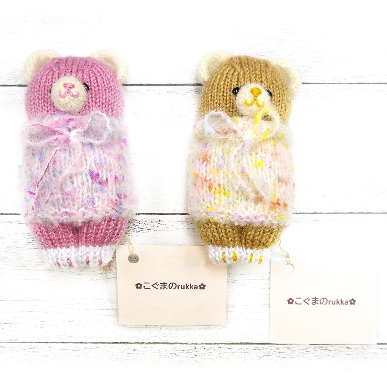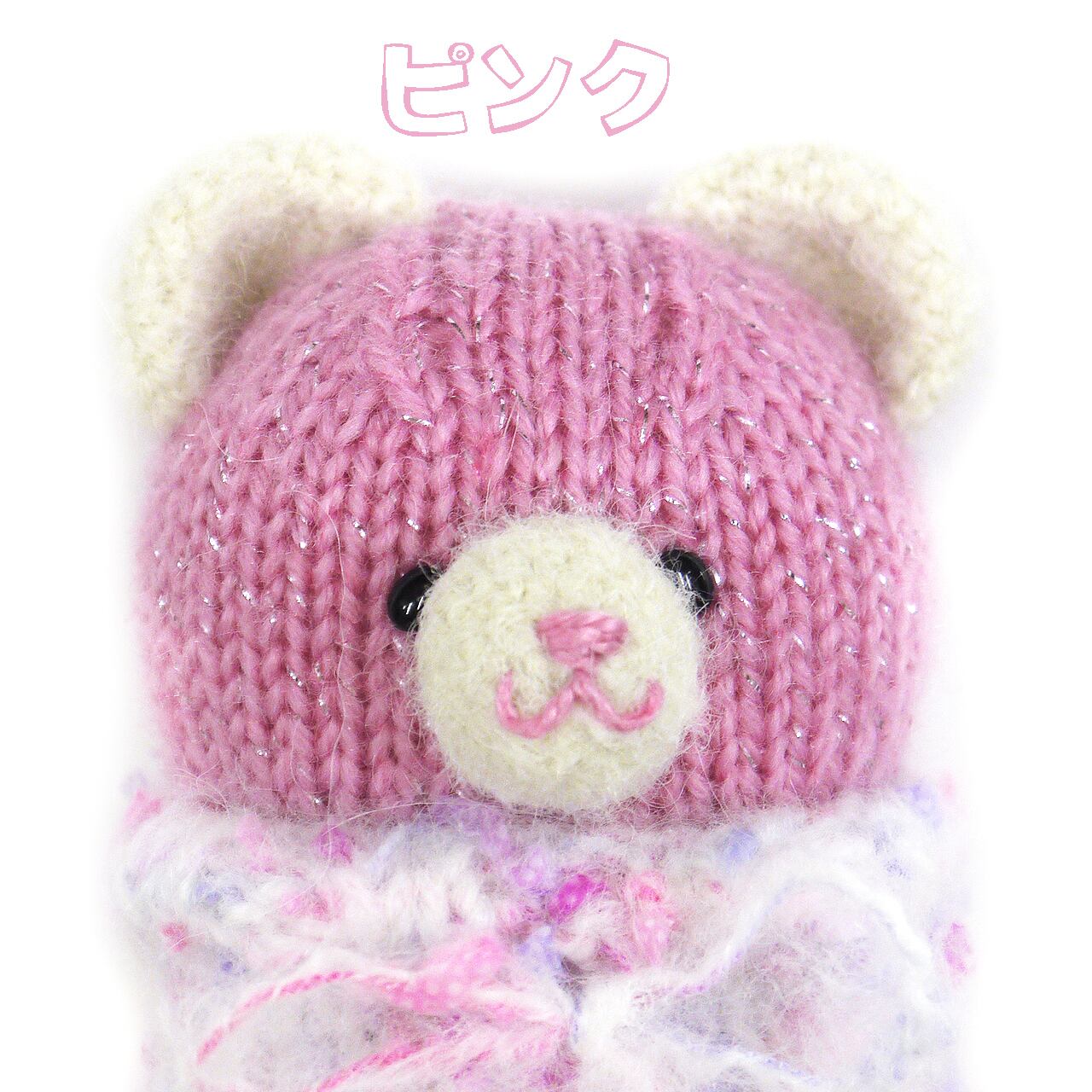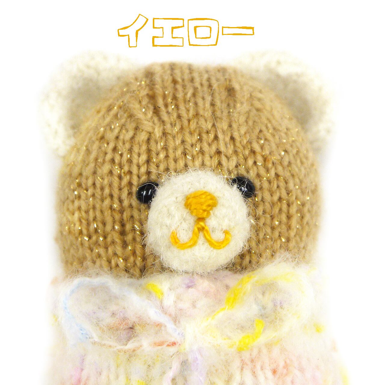 温かそうなリボン付きのパステルカラーセーターを着て、キラキラの毛糸を使用したくまさん。優しい手触りでお子さんにもおすすめです。