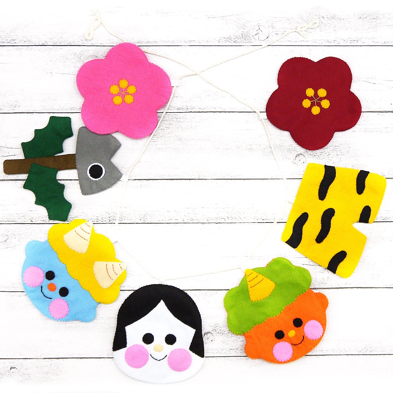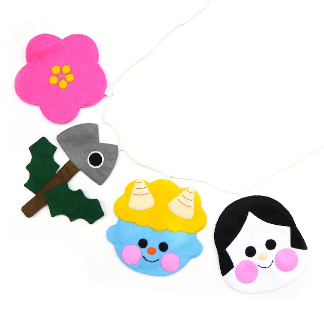 梅、鬼、おかめ、イワシの頭のモチーフを飾れるガーランド。紐付きで先端が輪っかになっているので、押しピンで固定できます。ひとつずつ飾ったり、キーホルダーパーツをつけて楽しむことも可能です。