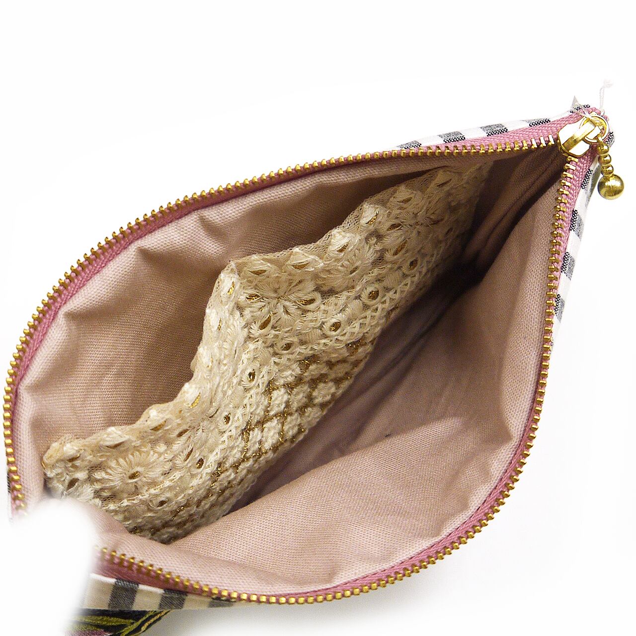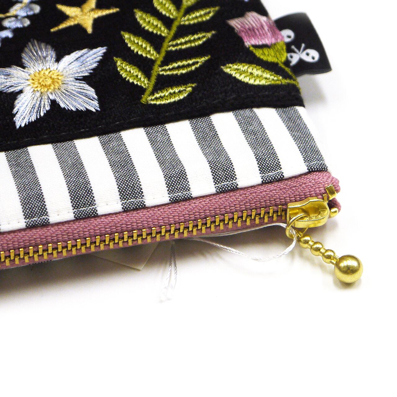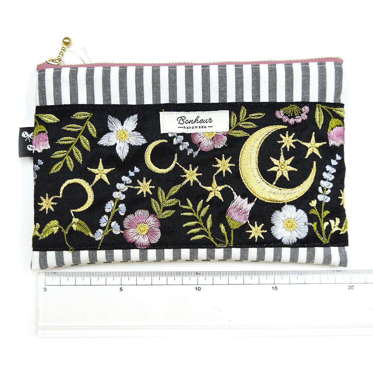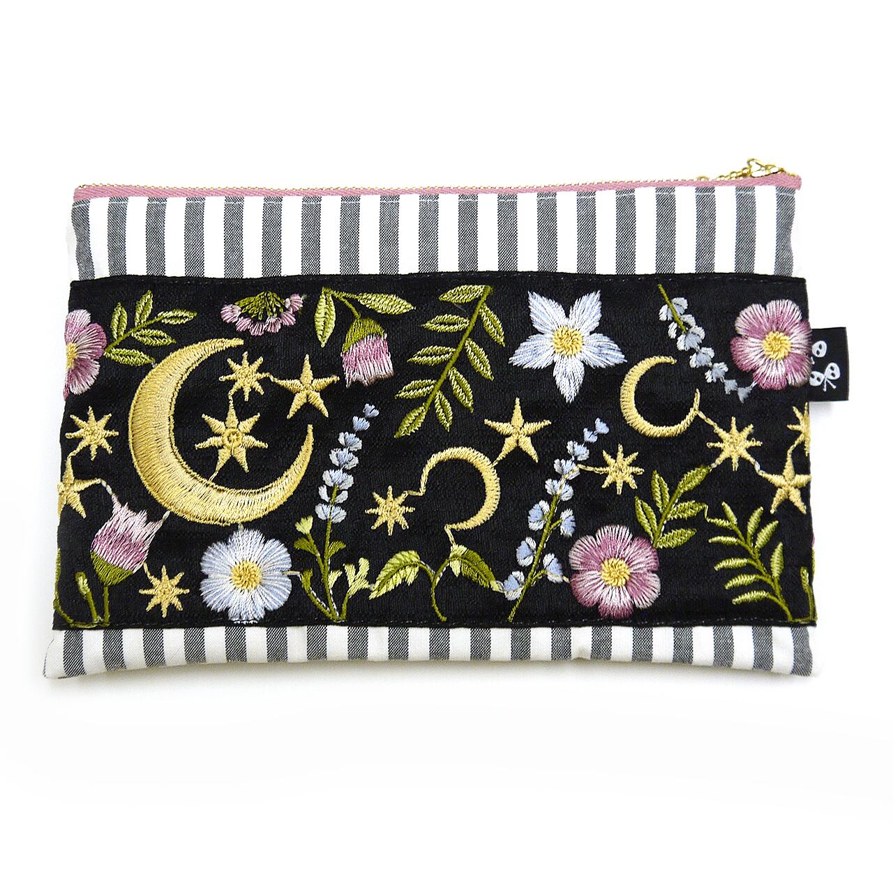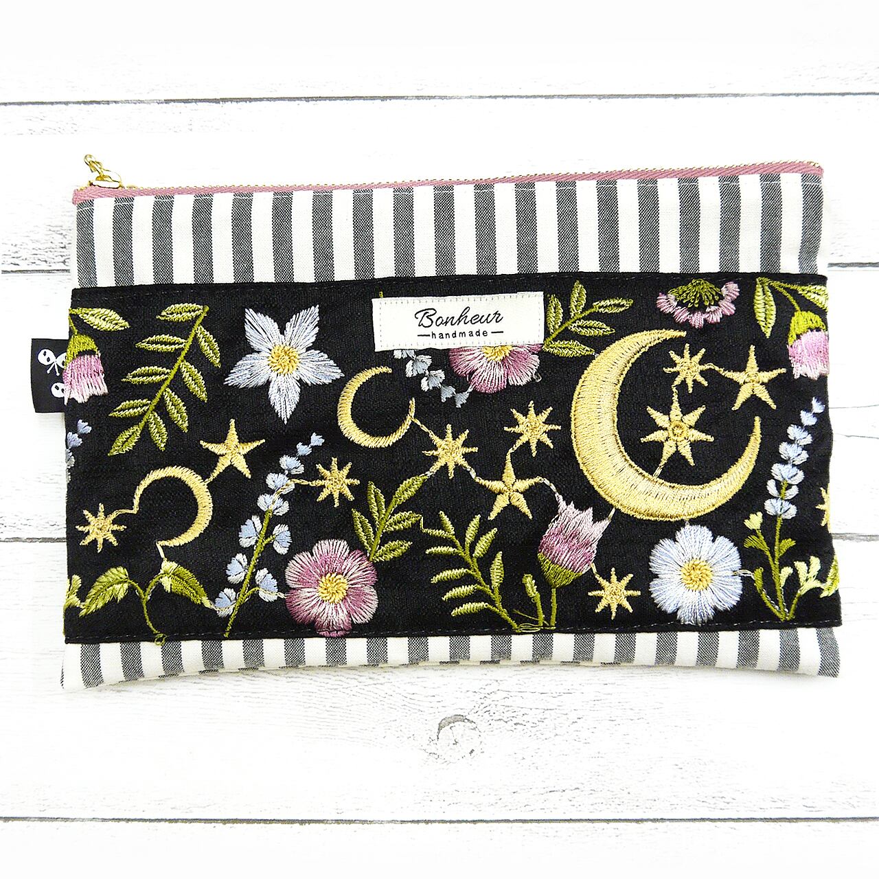 月とお花が大きく描かれた刺繍リボンをメインに、ストライプやくすみピンクの生地と組み合わせた大人かわいいデザイン。内側にもリボンのポケットがついています。