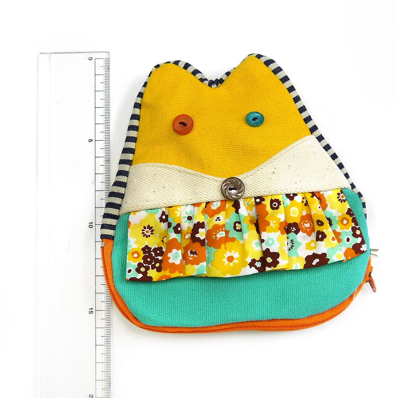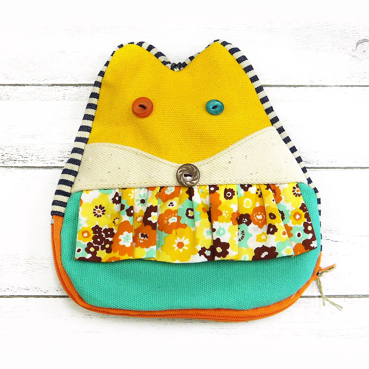 レトロを思わせる柄や色合わせもキュート。もっちりした形で、きつねさんらしいお顔の形も特徴的です。