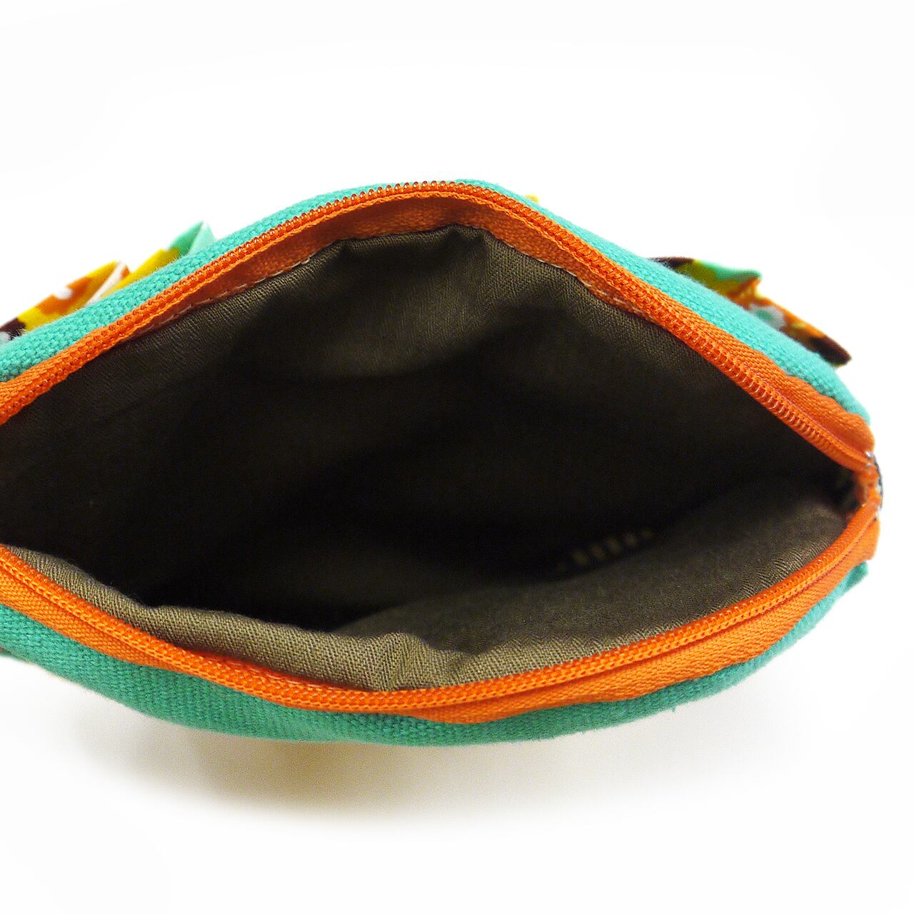 内側は無地の茶色。底部にファスナーがあります。ファスナーの稼働も非常に滑らかで、しっかりとした縫製のポーチです。