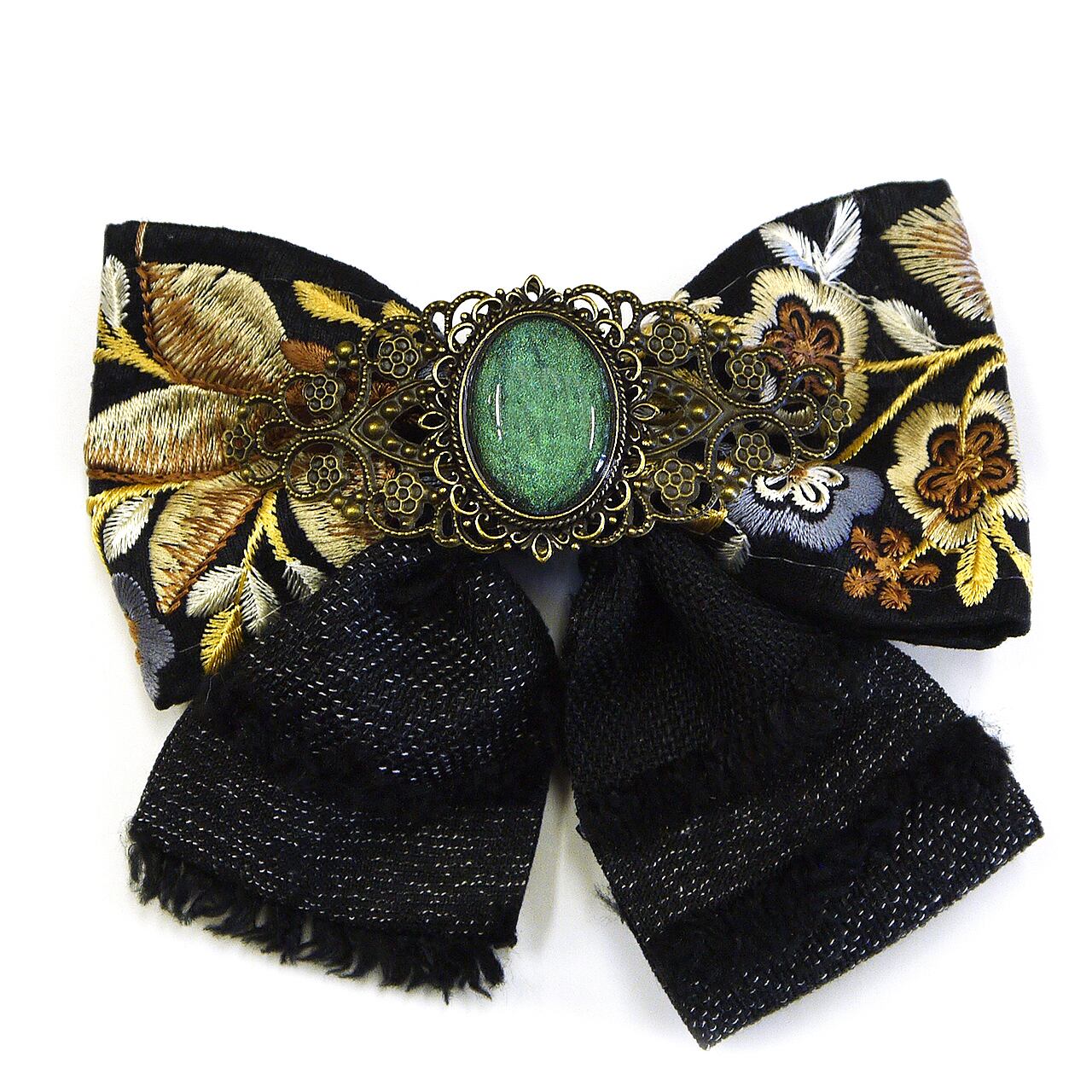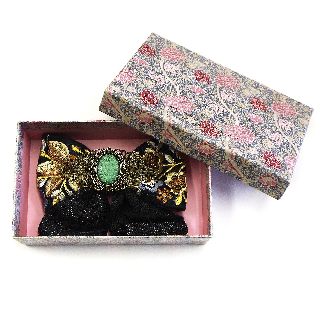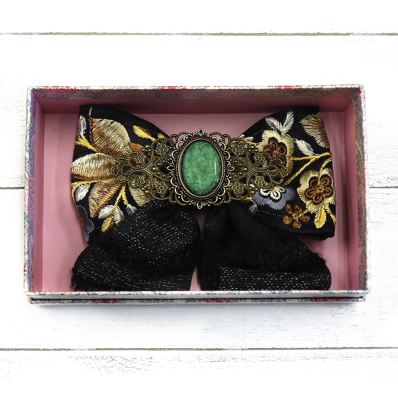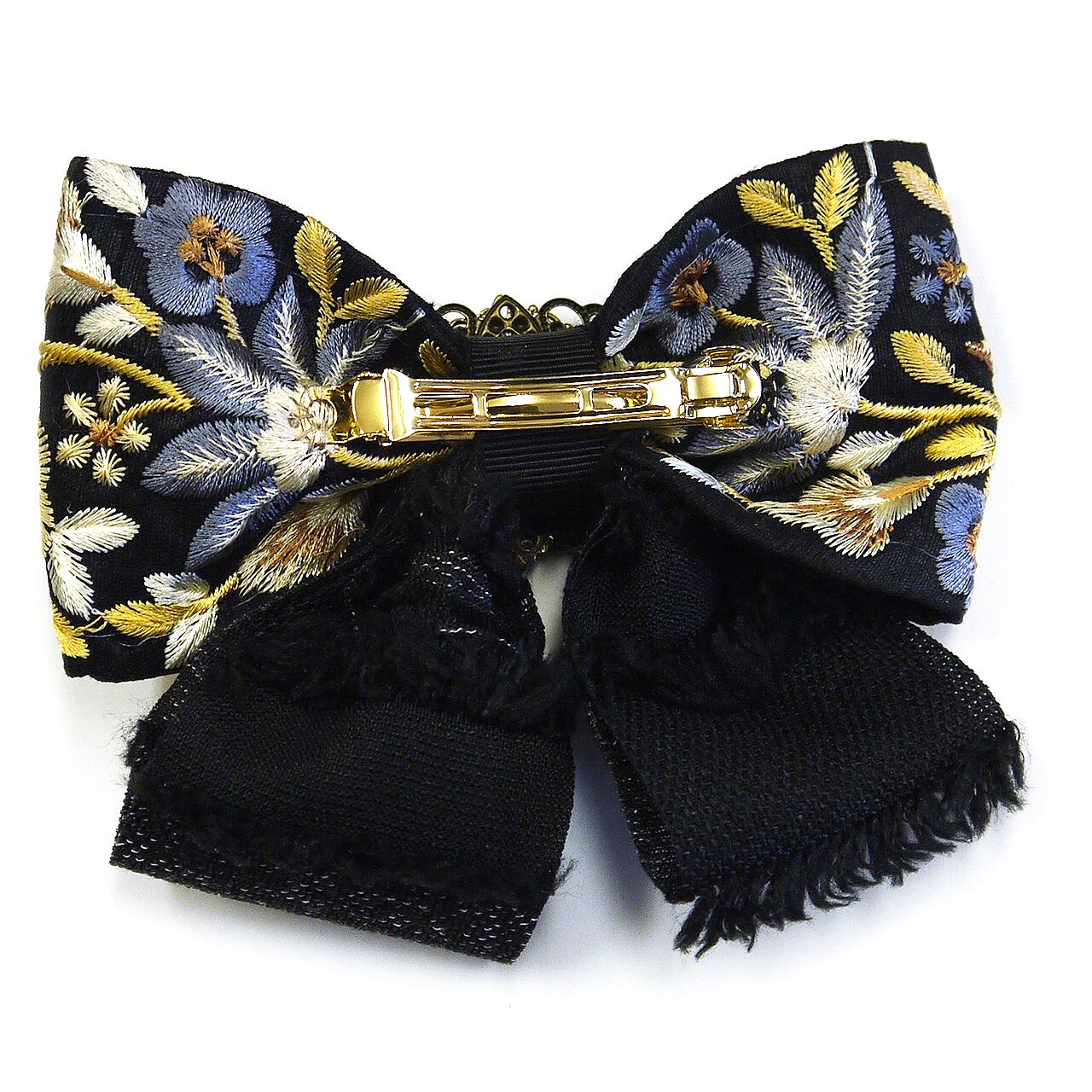 黒の刺繍リボンに合わせ、全体を黒くシックにまとめたバレッタ。透かしパーツともよく似合う、アンティークな雰囲気が魅力です。