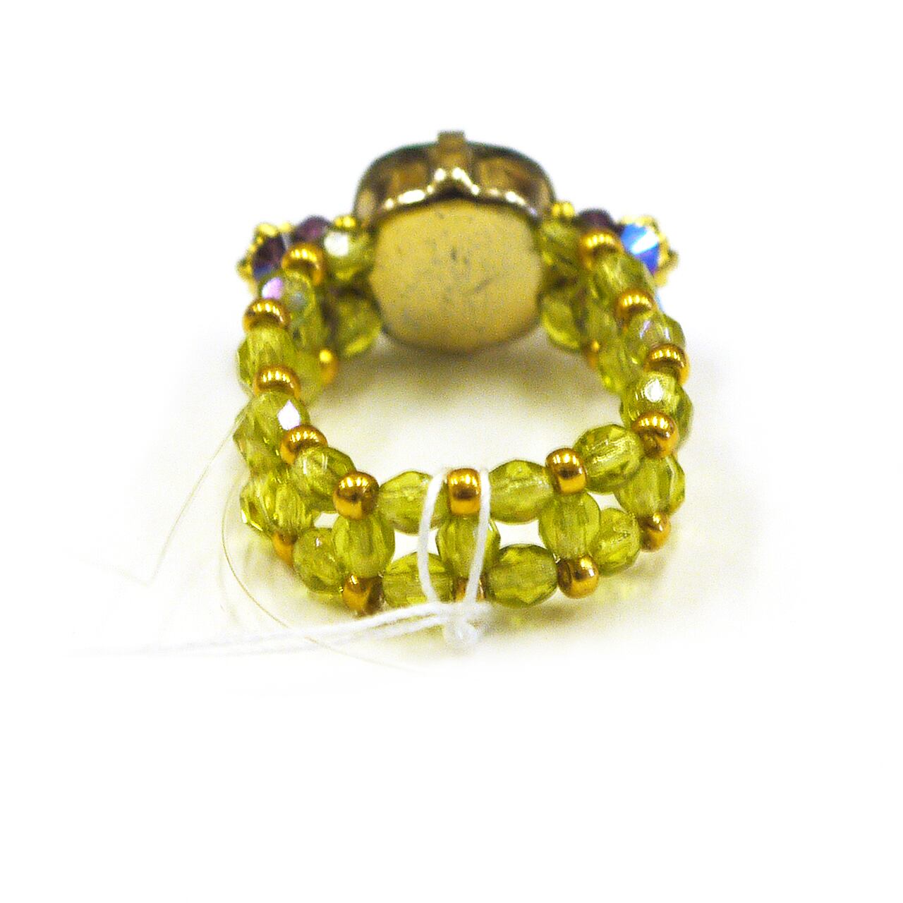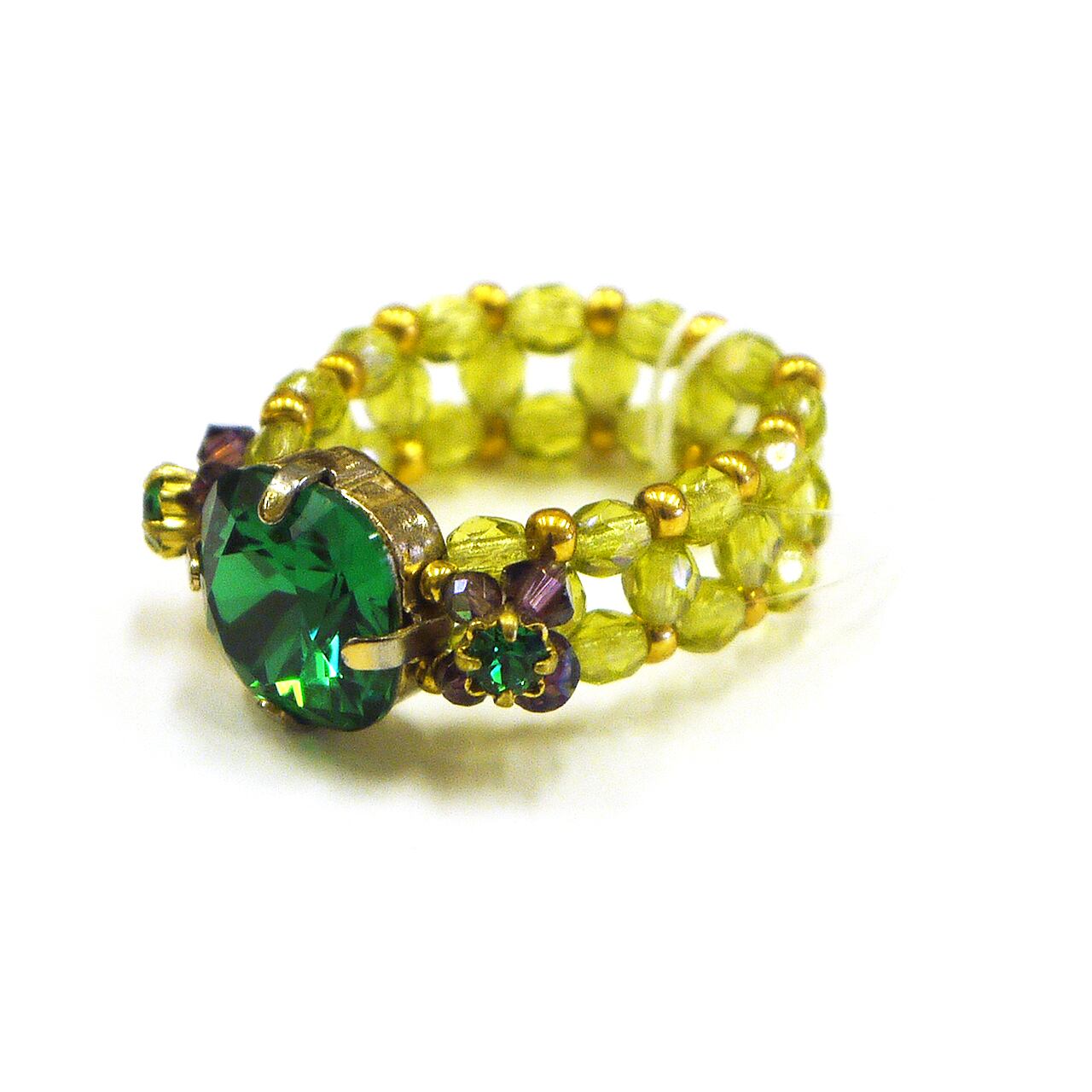 ビーズ編みと大振りのガラスストーンで作られた指輪です。