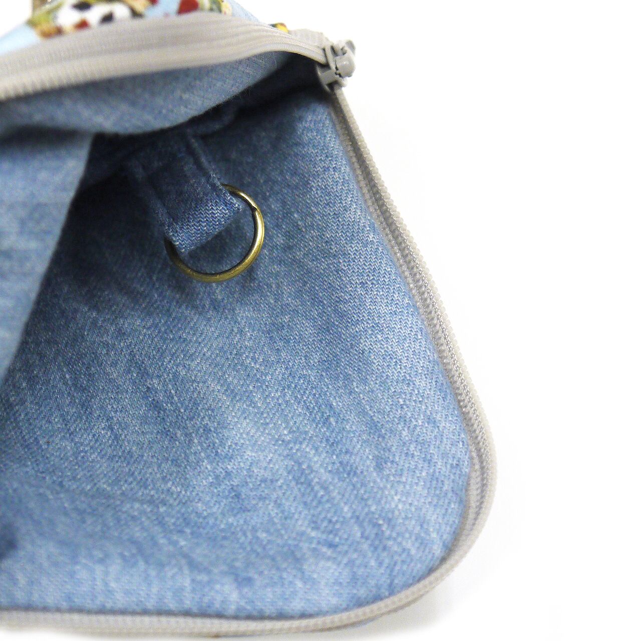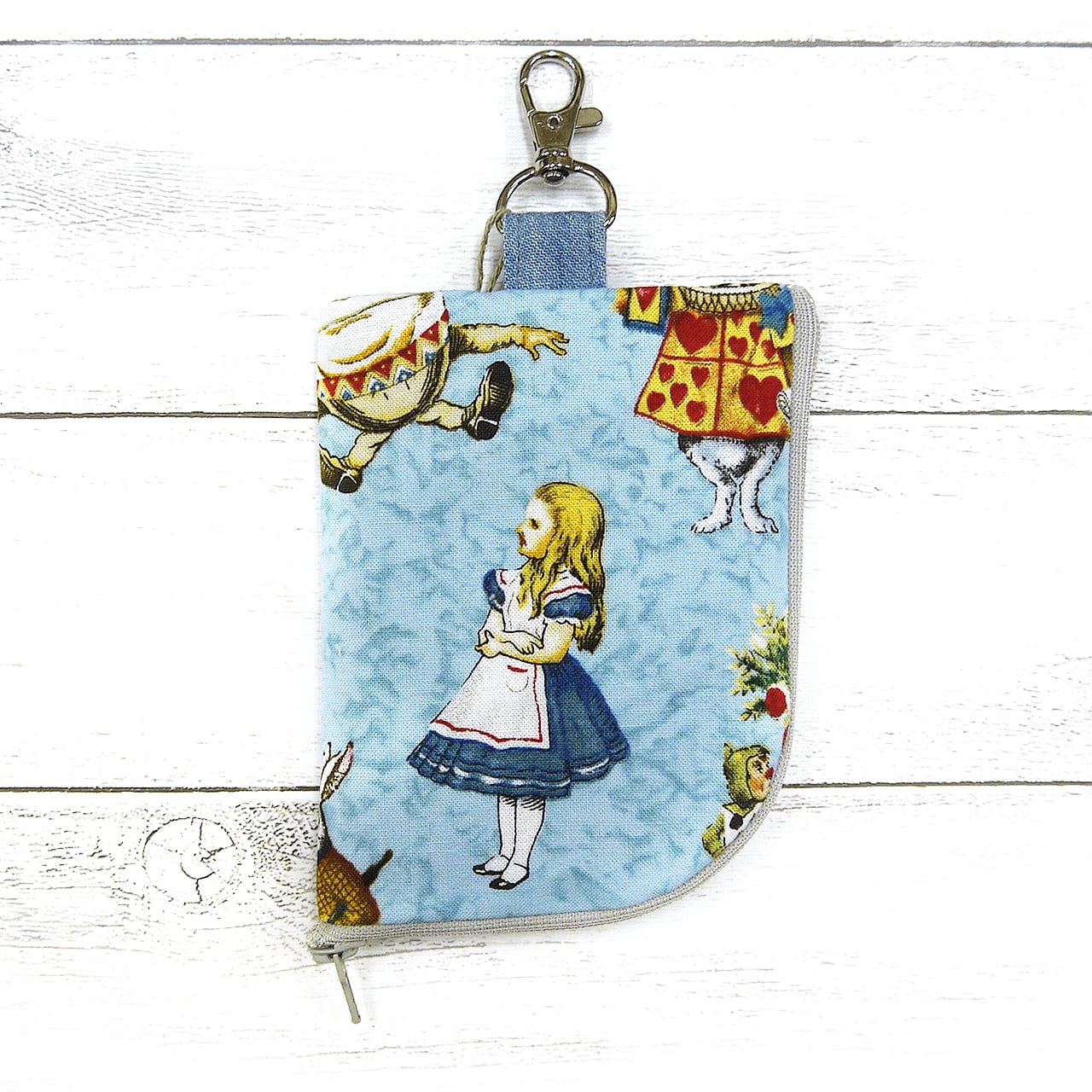 原作のアリスをモチーフにした生地で、かわいさとシックなおしゃれが同居するデザイン。内側はデニムカラーで、キーホルダーパーツに鍵を取り付けられるようになっています。