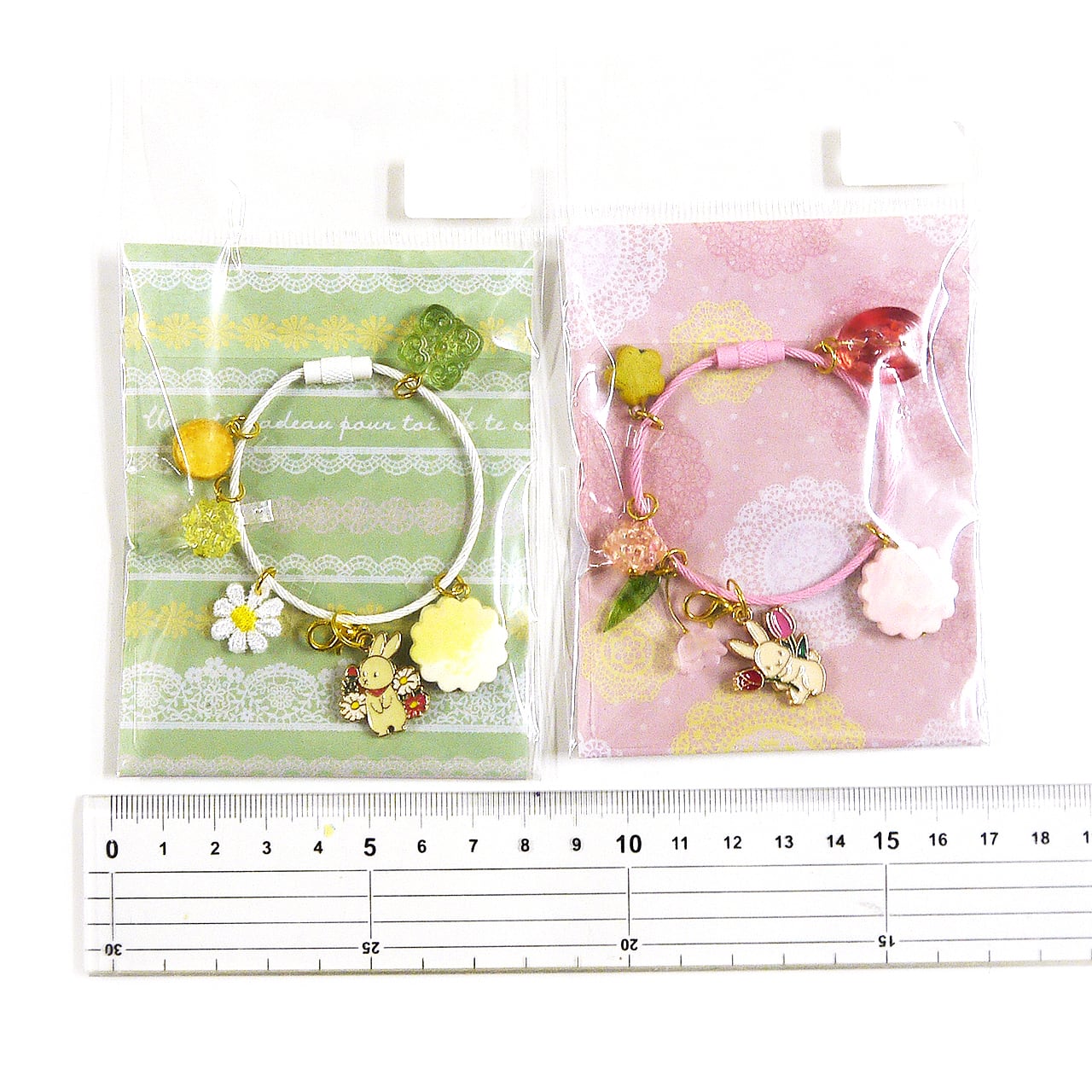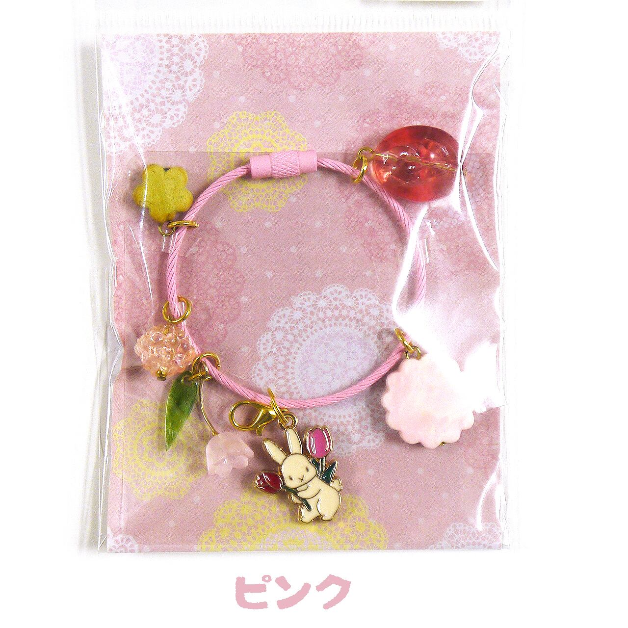 かわいいうさぎさん、お花、キャンディのようなビーズ、そしてフェイクスイーツのクッキーが配置されています。ガーリーでほんわかかわいい作品です。