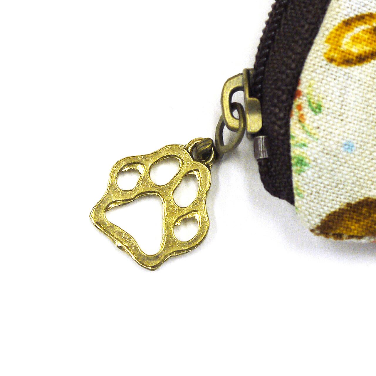 内側にはブルーの水玉柄、水色がかったレトロ柄によく似合う組み合わせになっています。ファスナー部分に使用されている肉球チャームもかわいいですね。