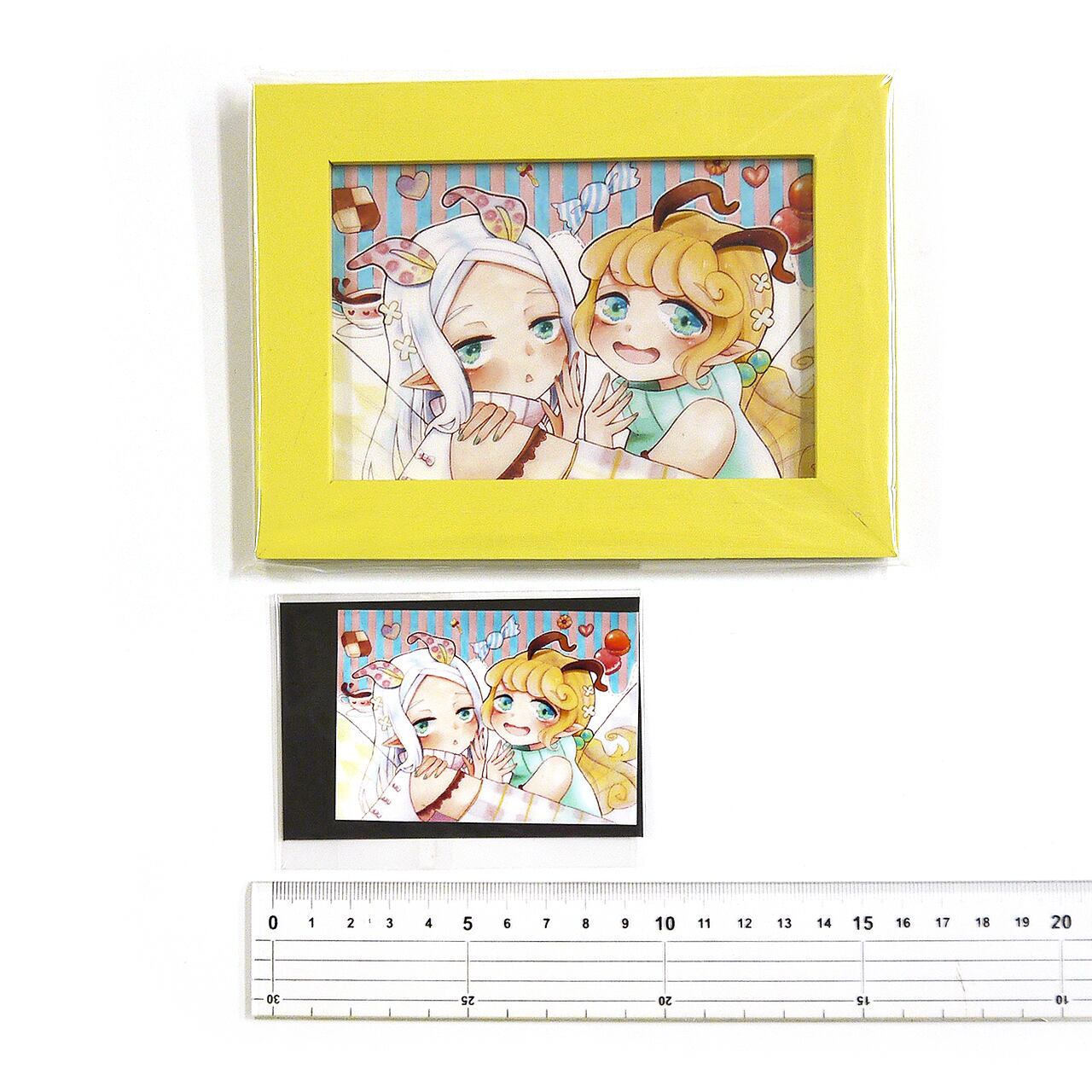 額入りのイラストと同絵柄の耐水ステッカーをセットにしてお届けします。