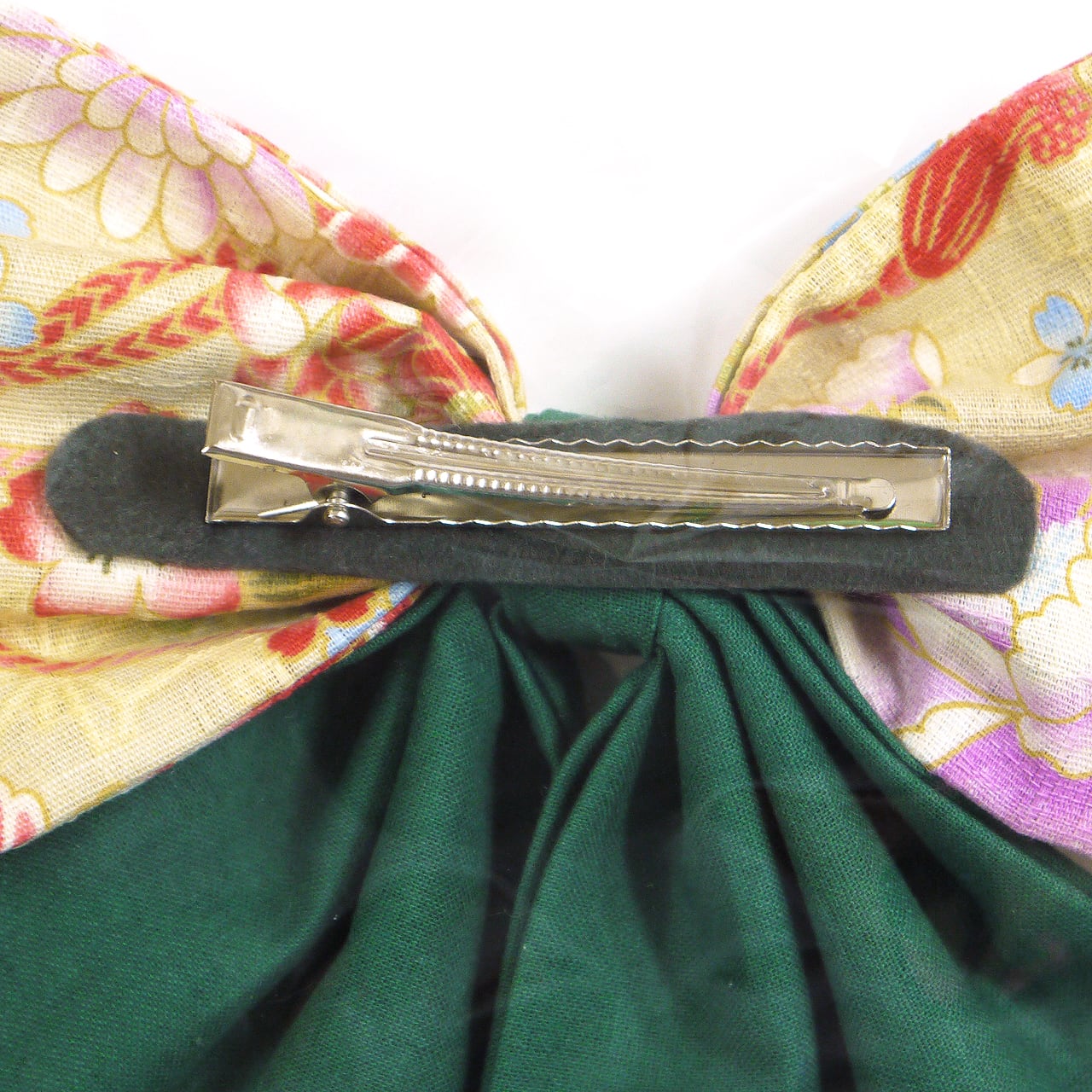 七五三や卒入学式、お正月、成人式などにぴったりのかわいらしくロマン溢れる和リボン。大きなリボンは存在感抜群でとっても目を引きます。柄と無地のツートンになっている点も素敵ですね。