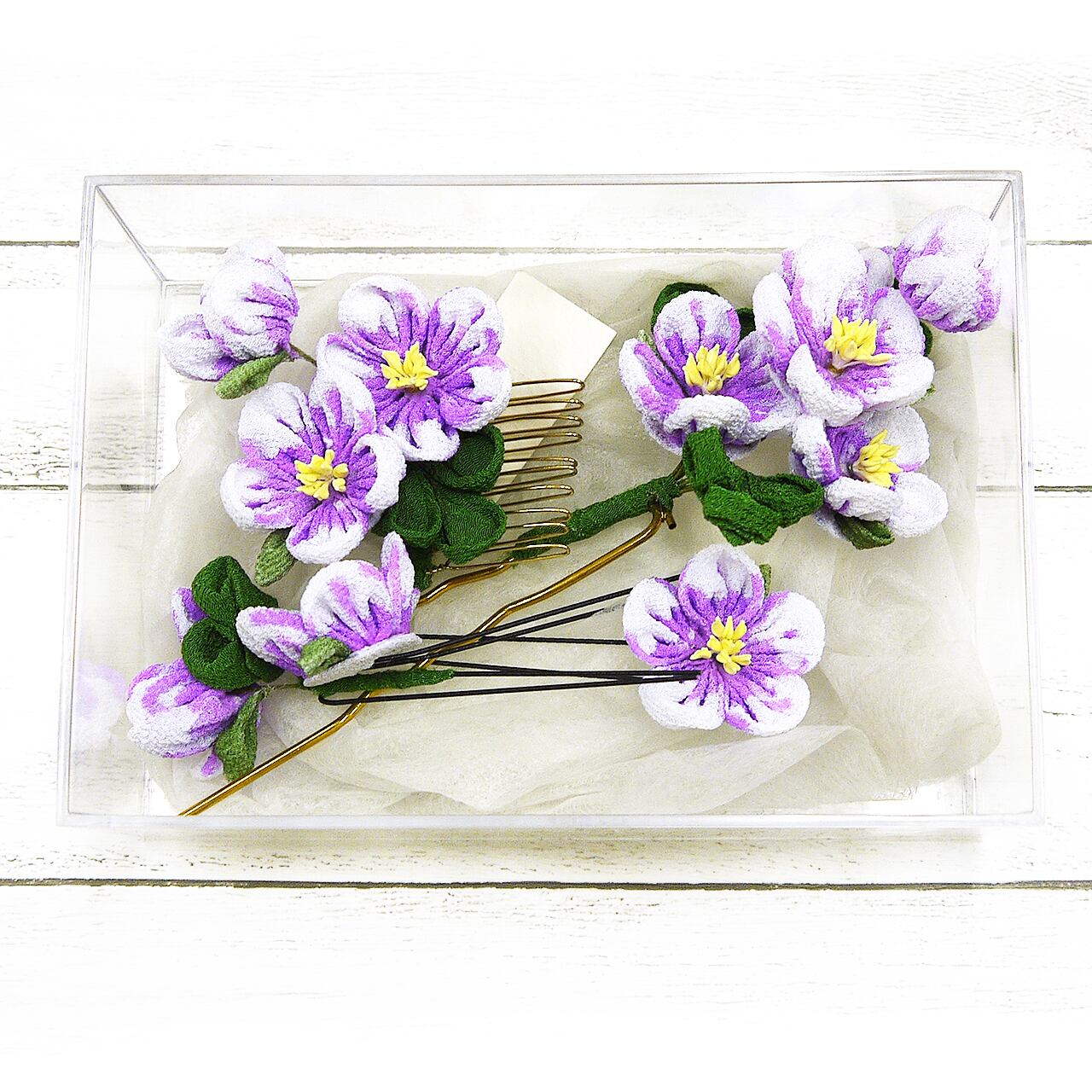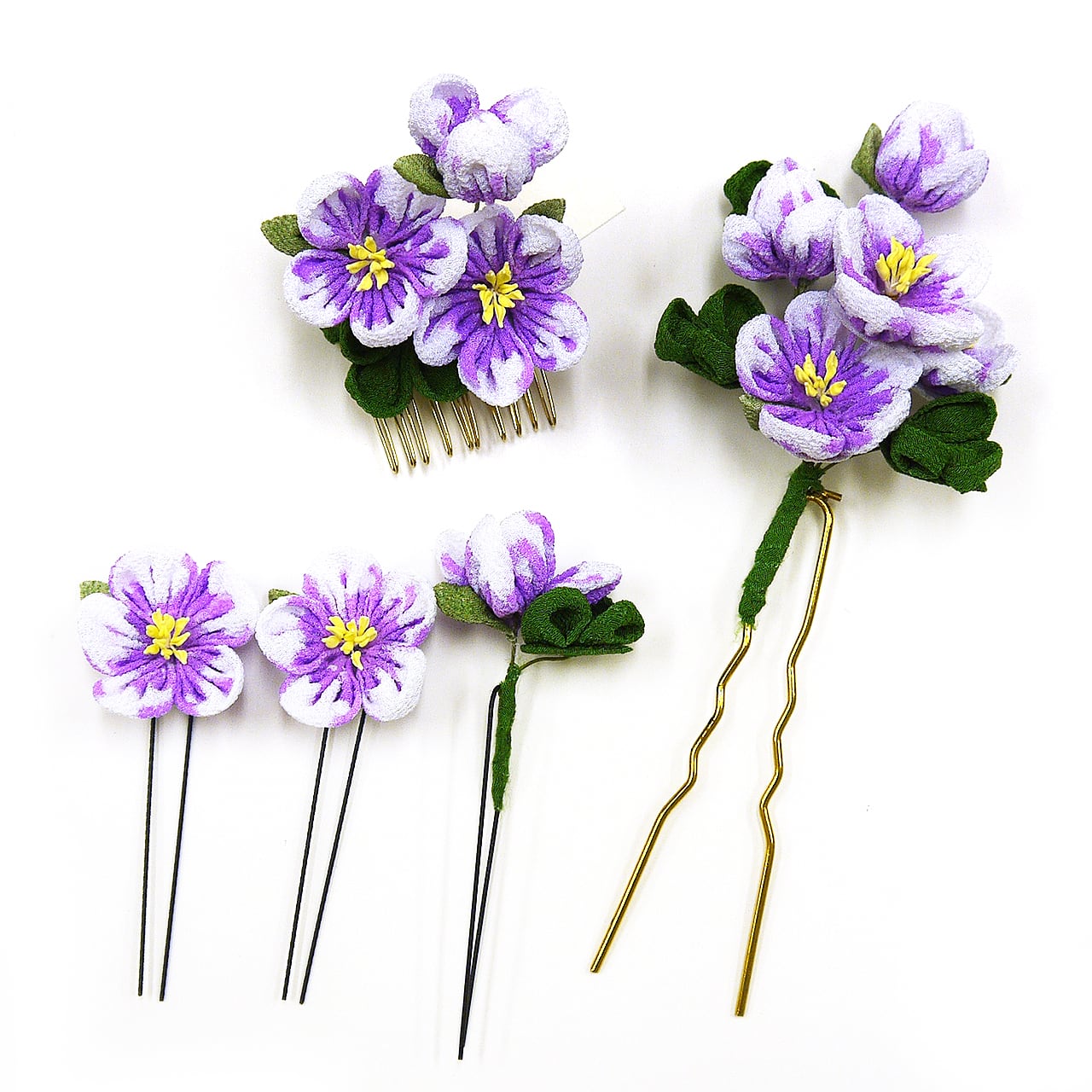 二股の簪、ヘアコーム、ヘアピンが揃った四点セット。晴れの日のヘアメイクにぴったりです。