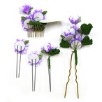 手染めの生地はぱっと明るい鮮やかさが目に付く美しさ。かわいらしい紫の花と葉っぱがデザインされたヘアアクセサリーセットです。